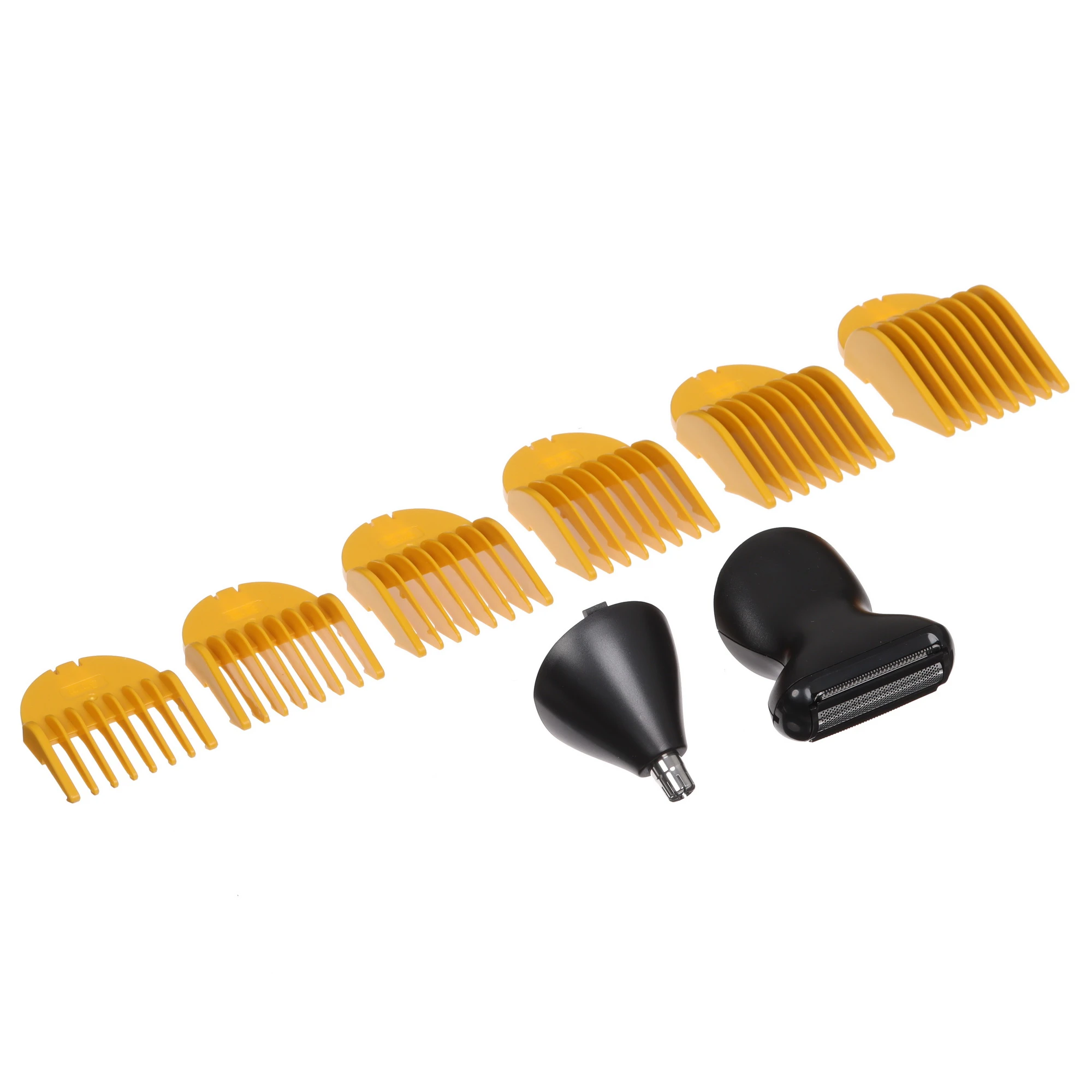 6 гребней для волос, зарядное устройство, масло для смазки, насадка для тела, насадка для ушей и носа, чехол, ещё