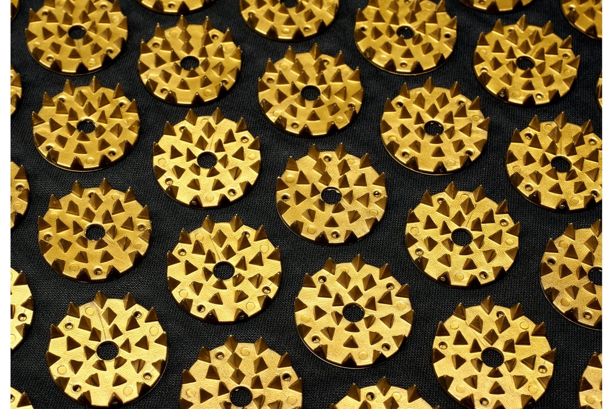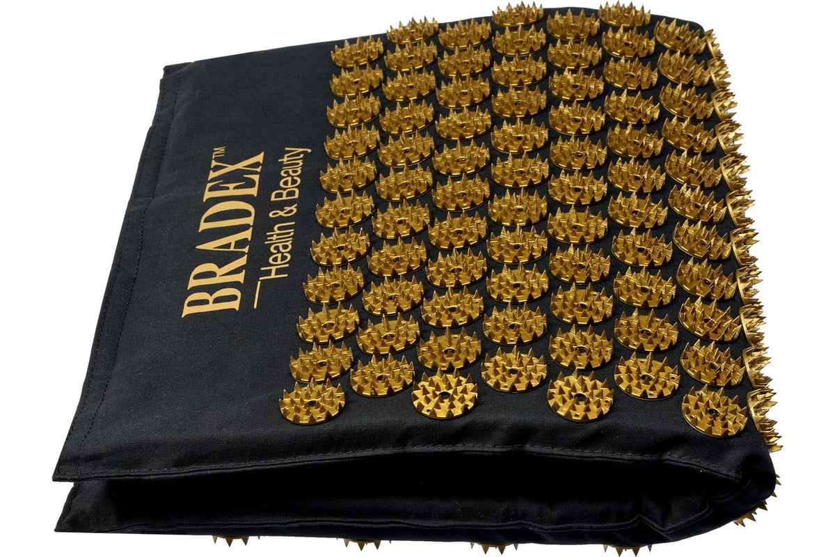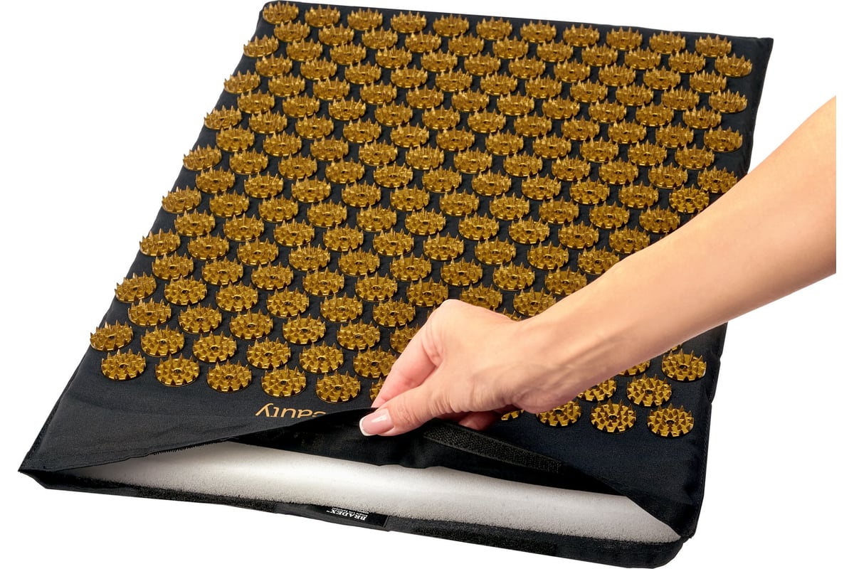 Медицинский массажный коврик с мягким наполнителем точечно воздействует на определенные участки тела с помощью острых акупунктурных шипов, расположенных на тканой хлопковой основе.