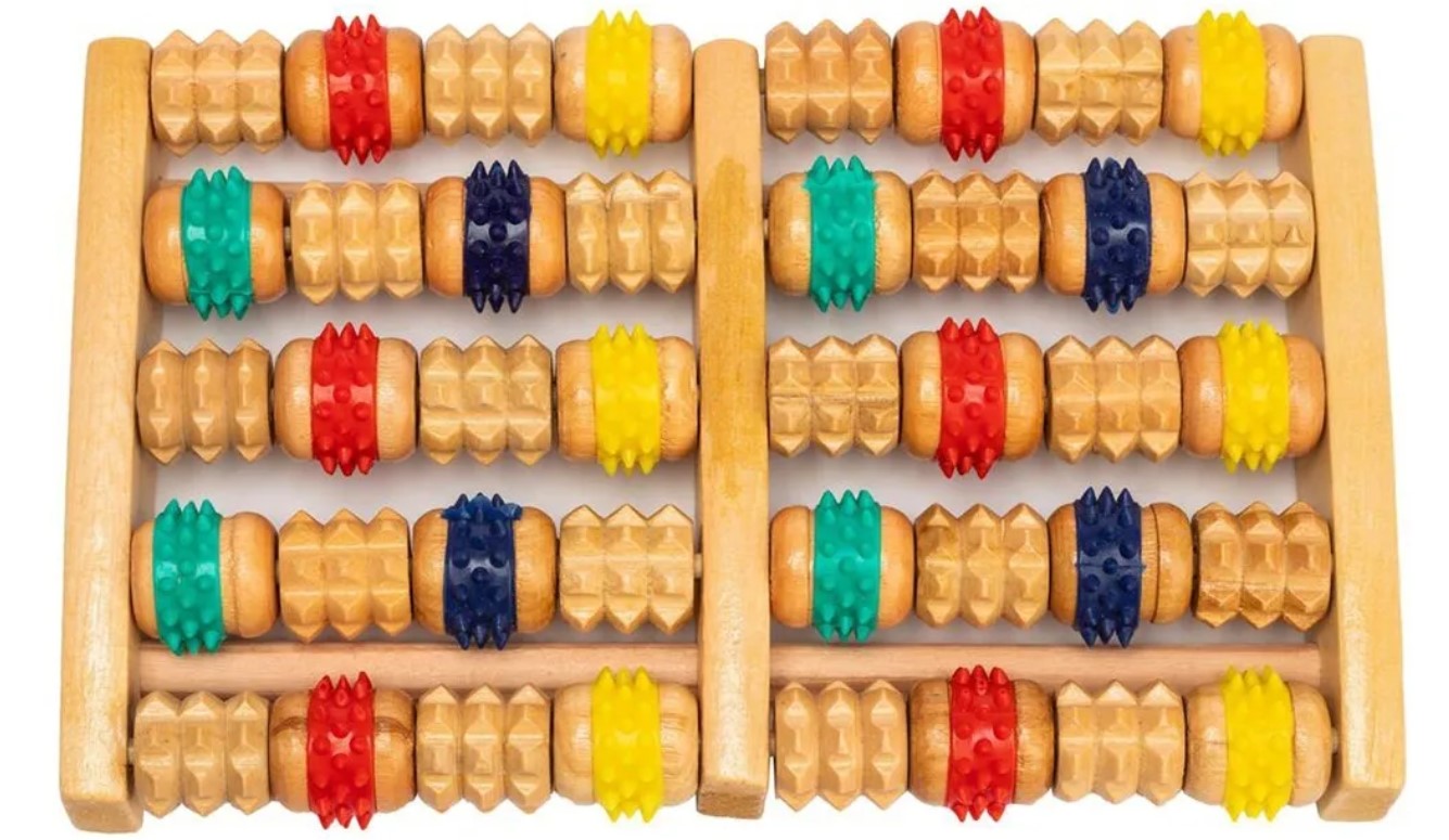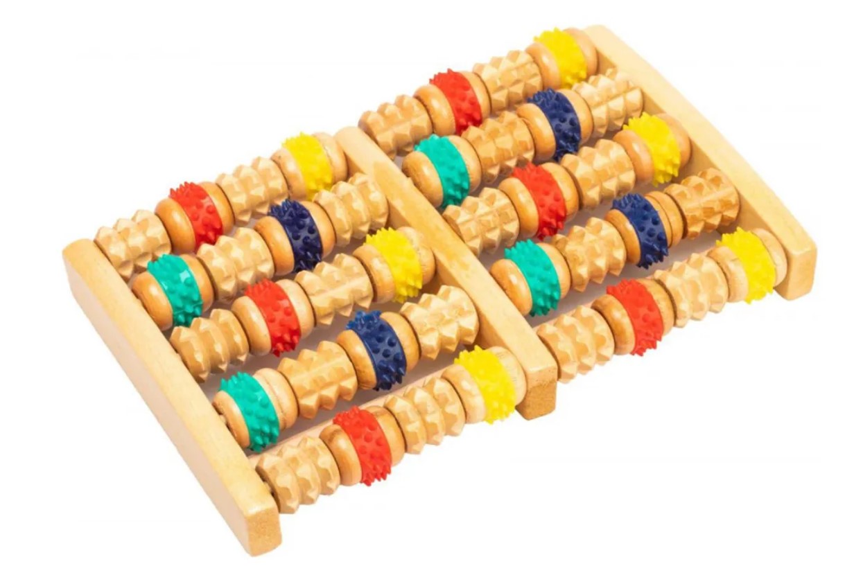 Массажер из натурального дерева приятен на ощупь, практичен и долговечен. 40 массажных роликов с разными видами шипов (дерево/резина) для акупунктурного массажа ступней, рук, спины и других частей тела.
