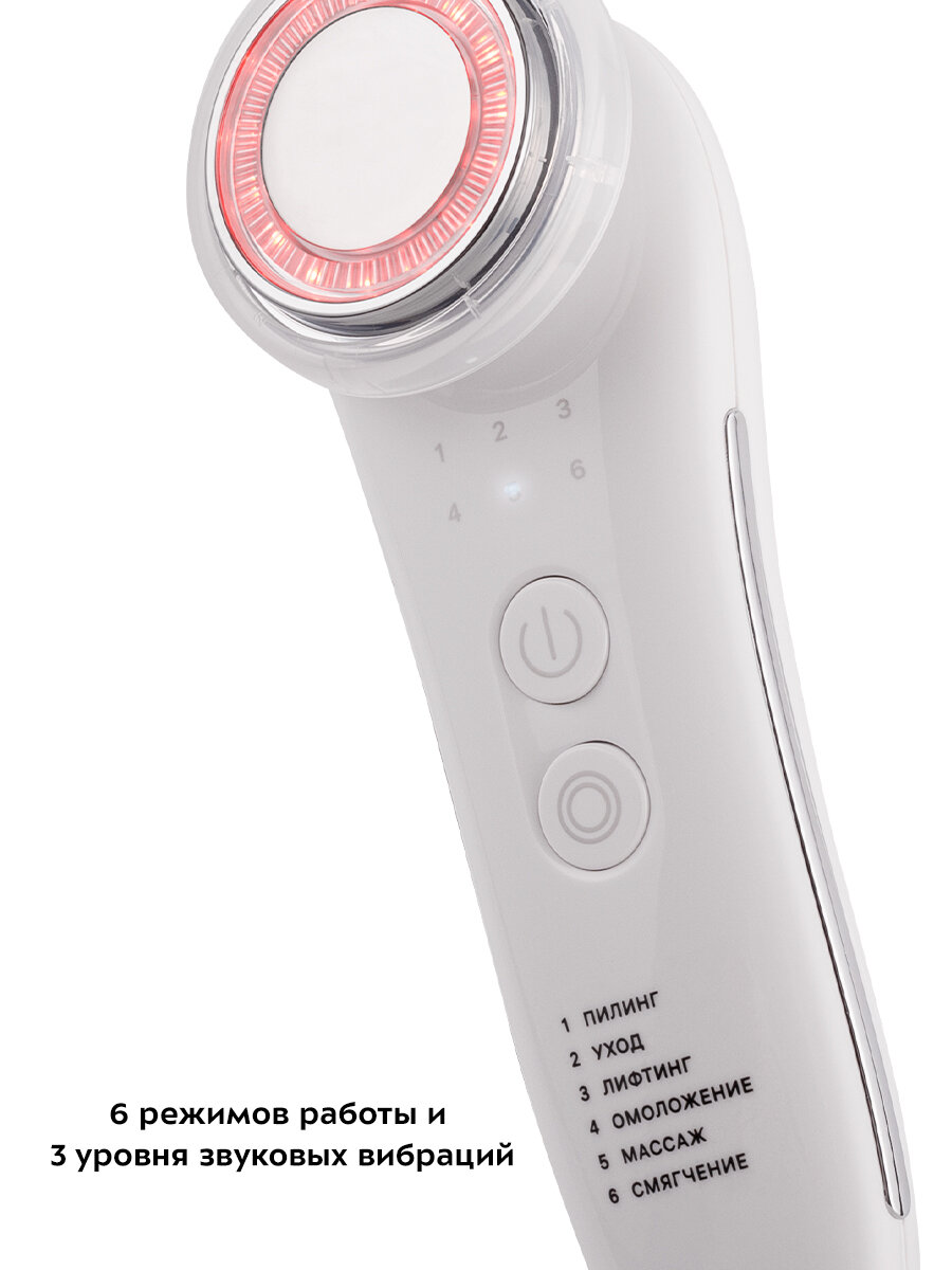 Массажер оснащен 6 режимами: «Пилинг», «Уход», «Лифтинг», «Омоложение», «Массаж», «Смягчение». В режимах комбинируется воздействие звуковых и ультразвуковых вибраций, тепла и света. Также вы можете выбрать 1 из 3 уровней воздействия звуковыми вибрациям.