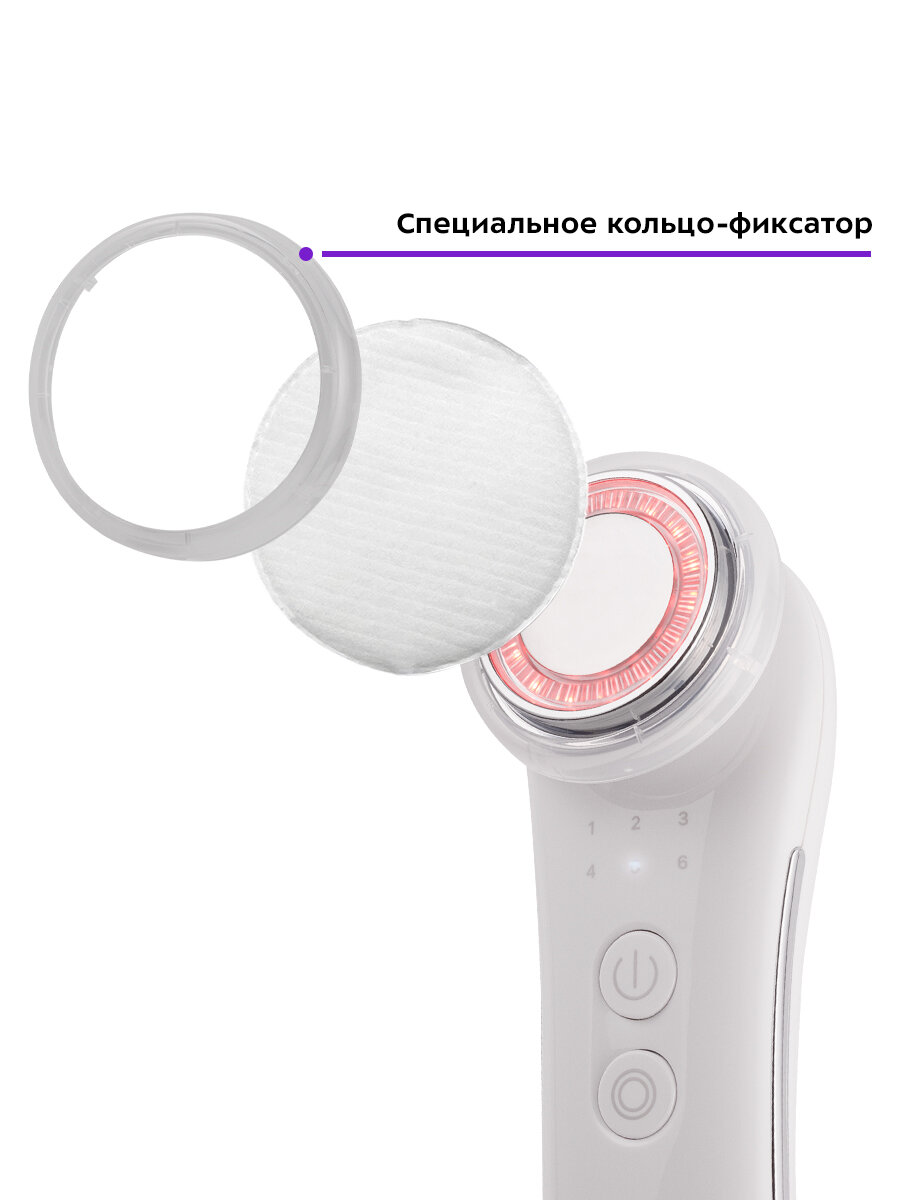 Вы можете закрепить тонкий ватный диск, пропитанный вашим увлажняющим или очищающим тонером или лосьоном для лица на рабочую поверхность прибора с помощью кольца-фиксатора.