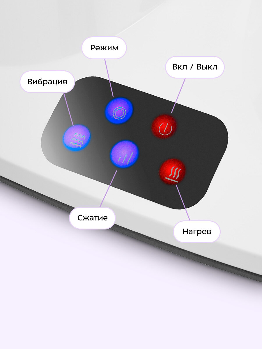 Прибор сочетает в себе воздушно-компрессионный, вибрационный и роликовый массаж, а также нагрев. Предустановленная длительность массажа — 15 минут. По прошествии этого времени массажер автоматически отключится.