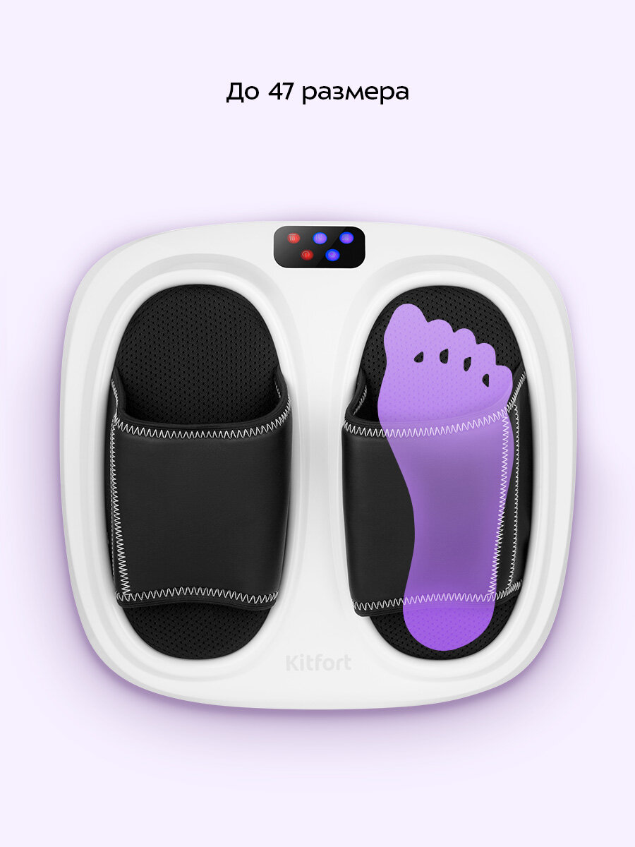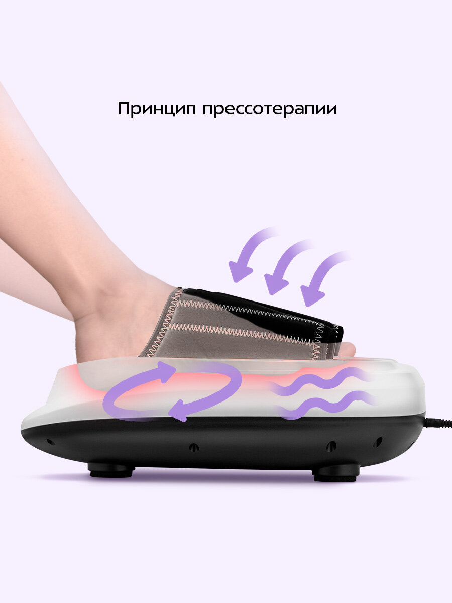 Прибор сжимает стопы, создавая эффект компрессии, происходит вибрация, массажные ролики воздействуют на акупунктурные точки, при этом осуществляется нагрев. В массажёр вмещаются ноги от 35 до 47 размера включительно.