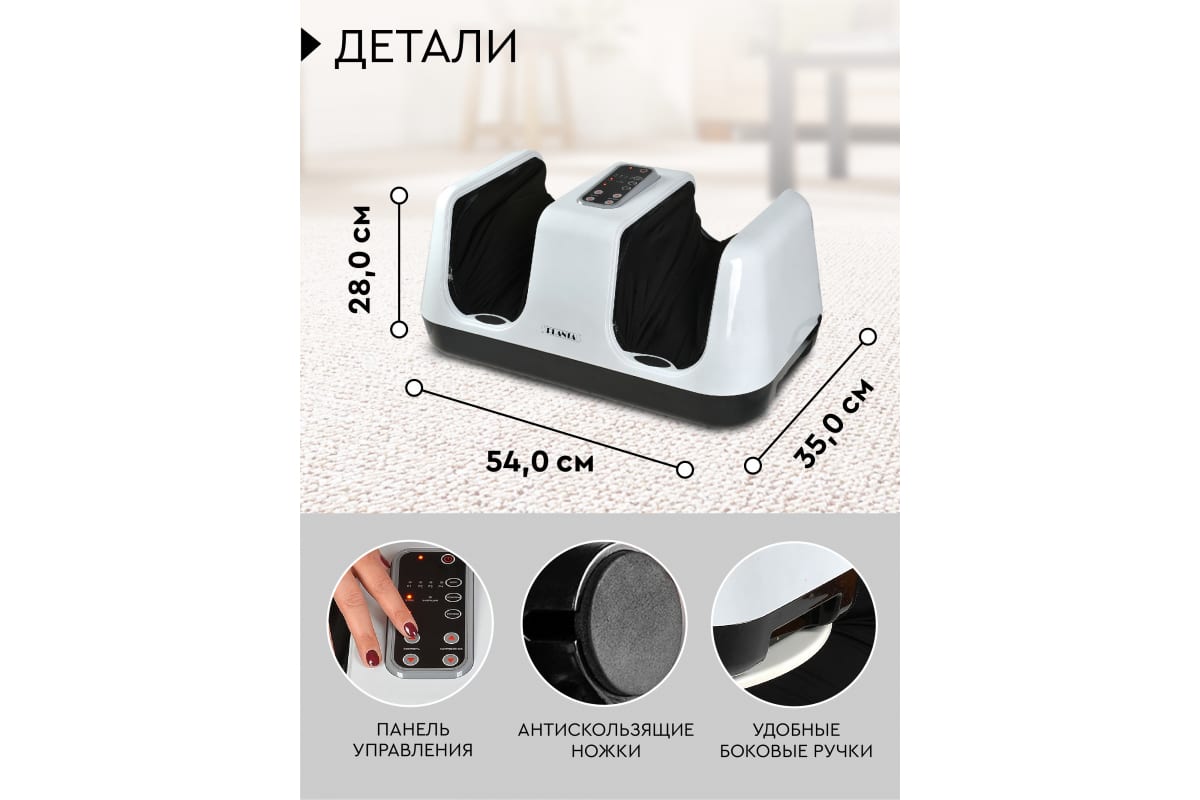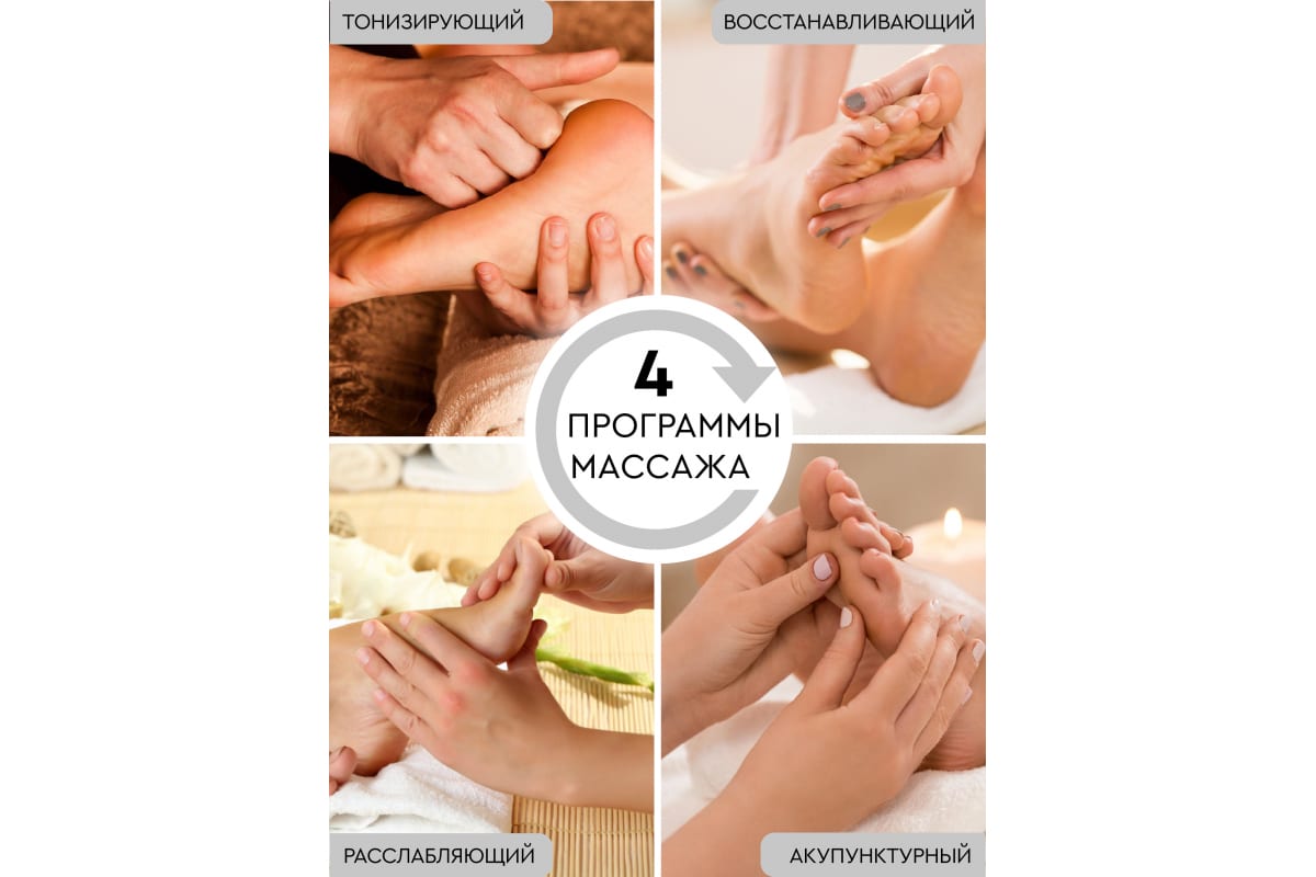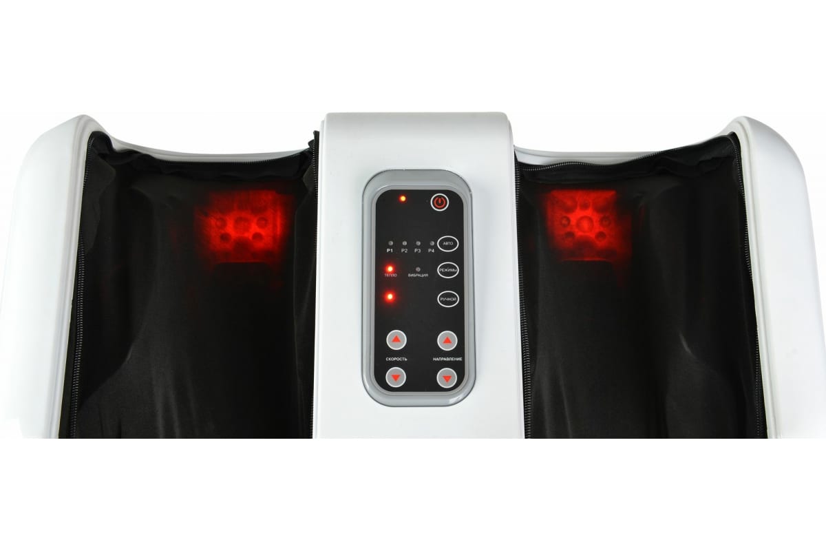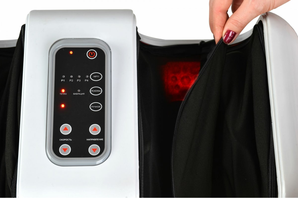 Имеет 4 функции: роликовый массаж стоп, компрессионный массаж лодыжек, вибрационный массаж и инфракрасный подогрев.