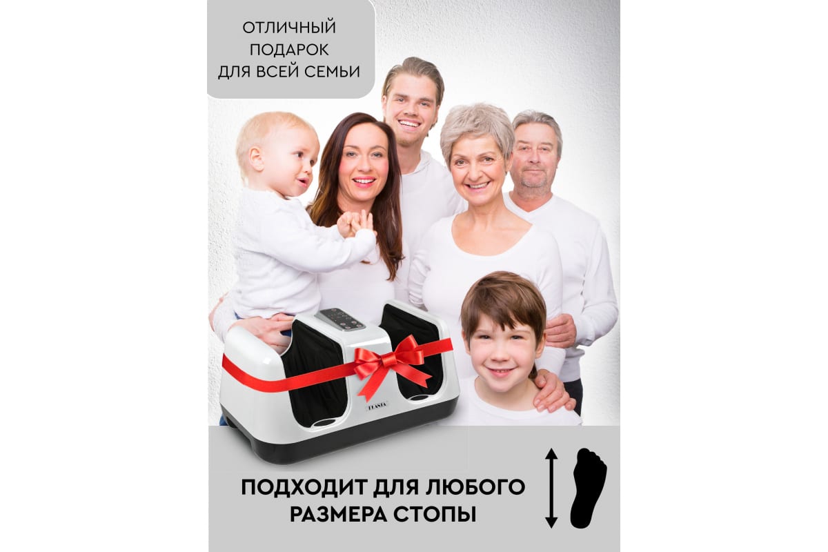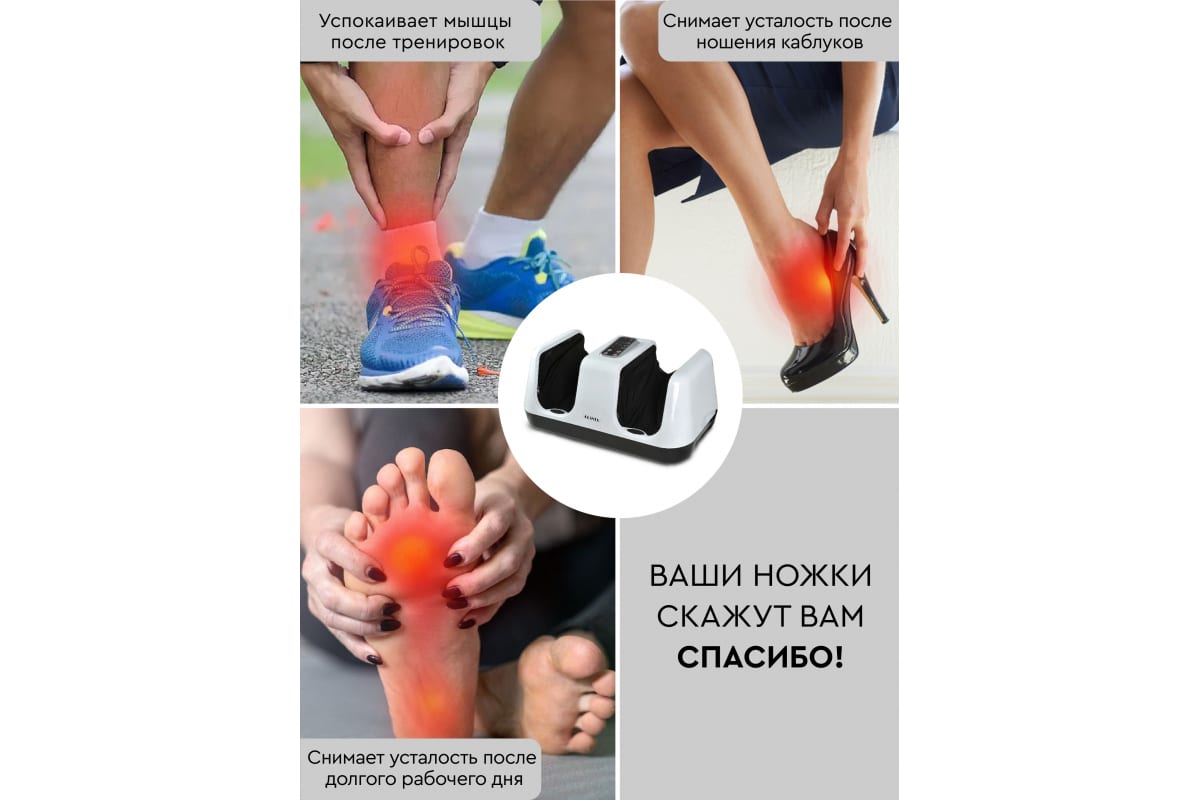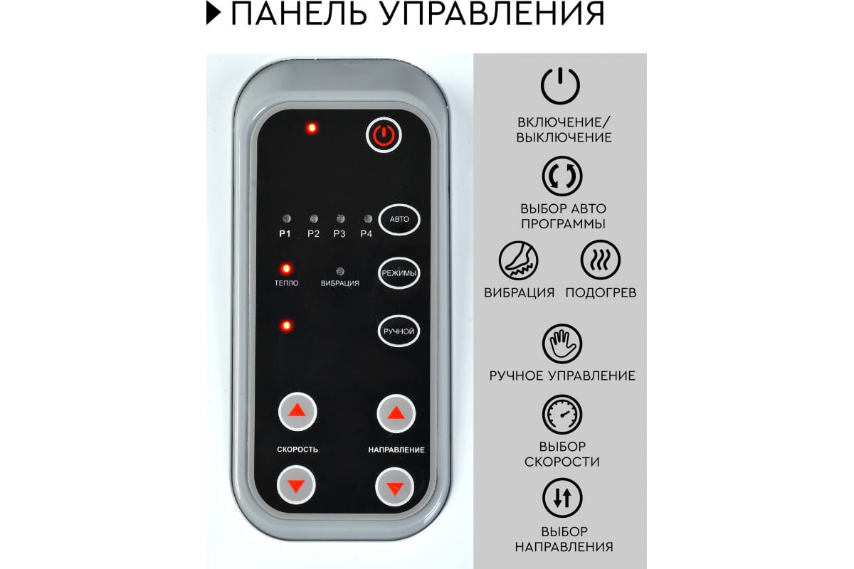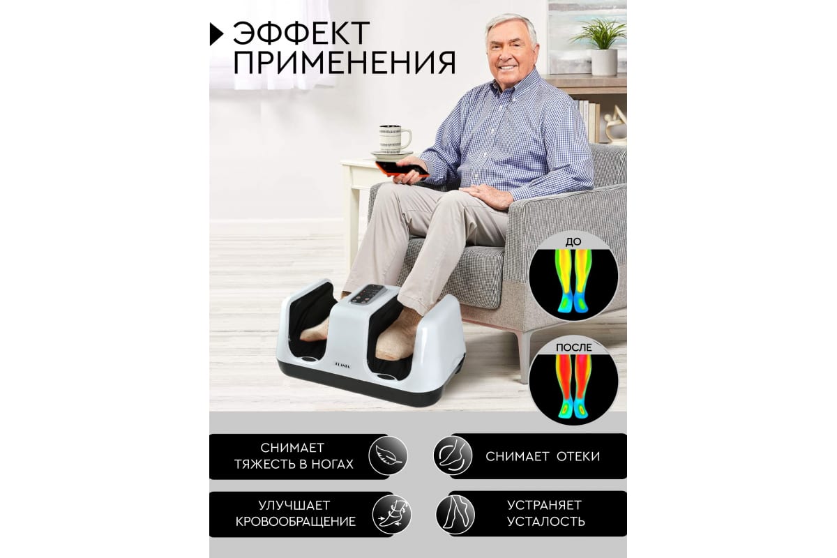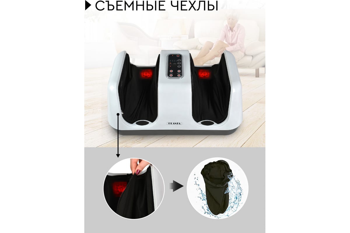Имеет 4 функции: роликовый массаж стоп, компрессионный массаж лодыжек, вибрационный массаж и инфракрасный подогрев.