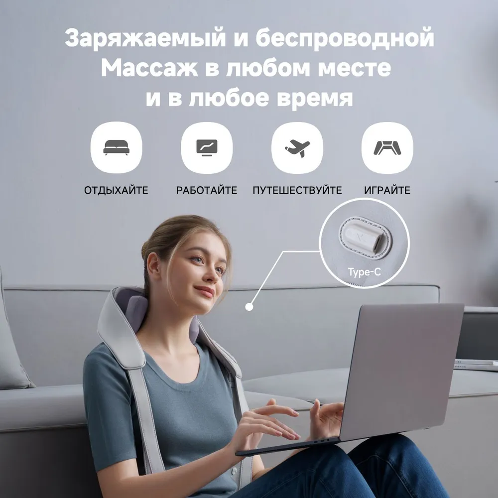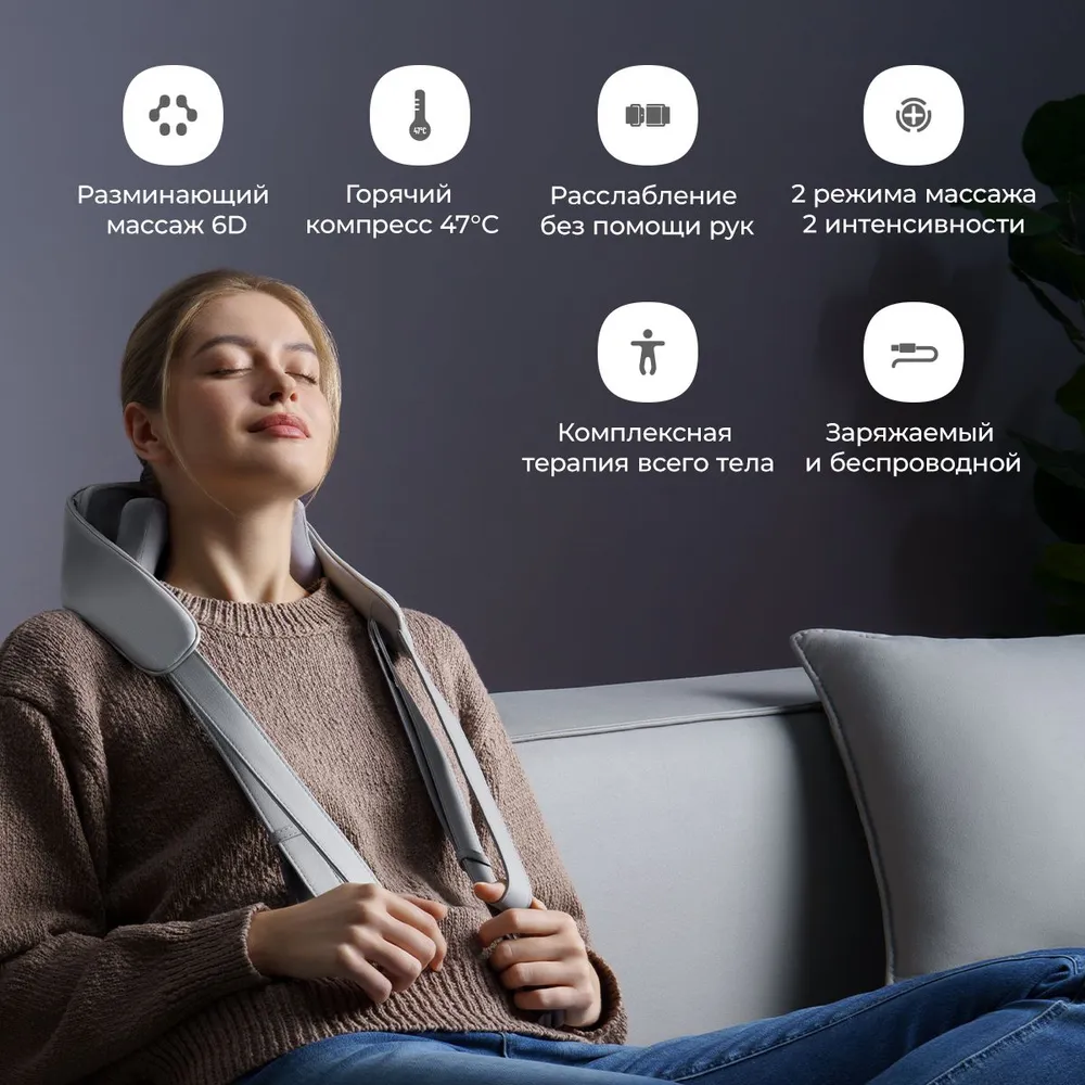 Функция подогрева позволяет разогреть шею и плечи, обеспечивая дополнительный комфорт. Во избежание перегрева функция автоматически отключается через 10 минут использования.