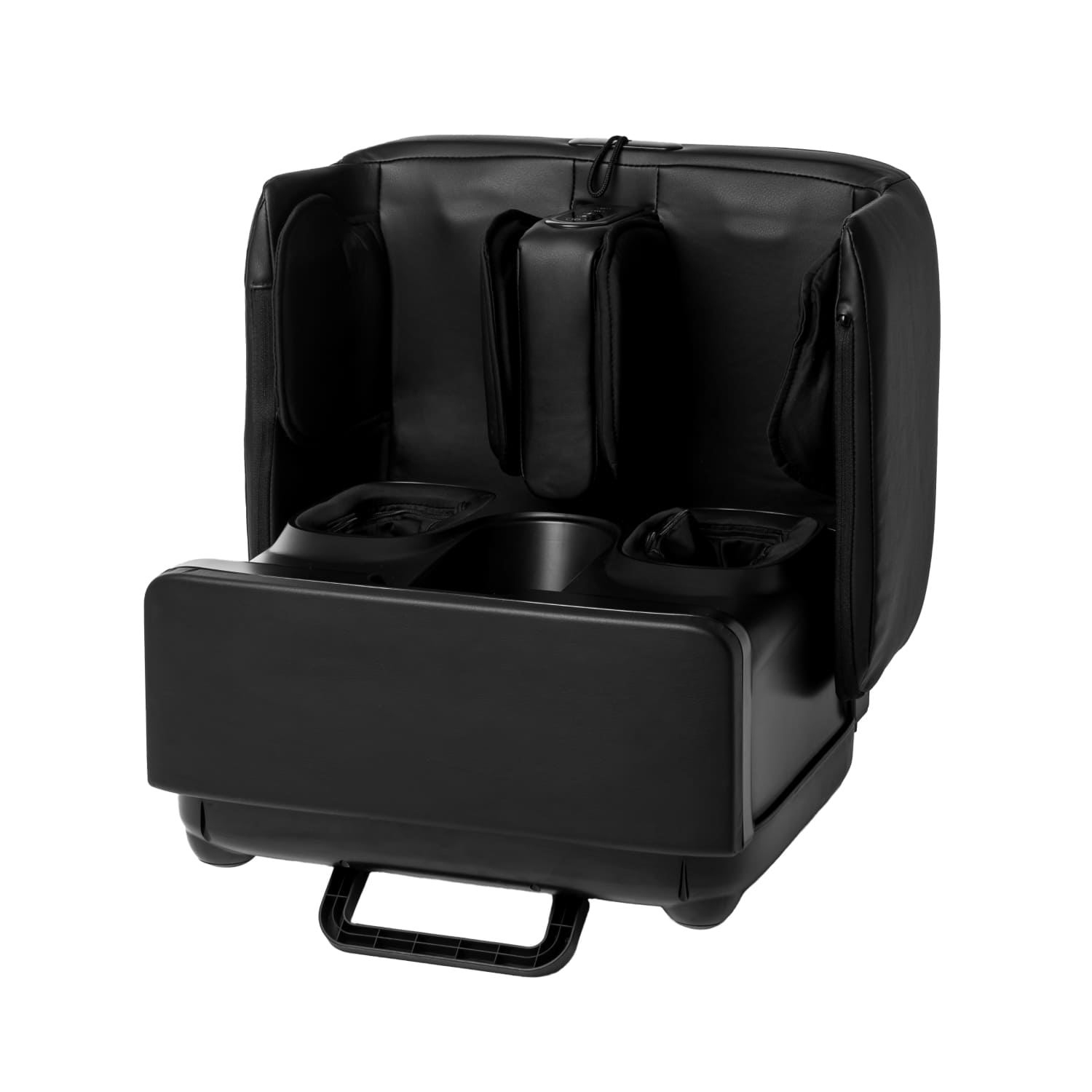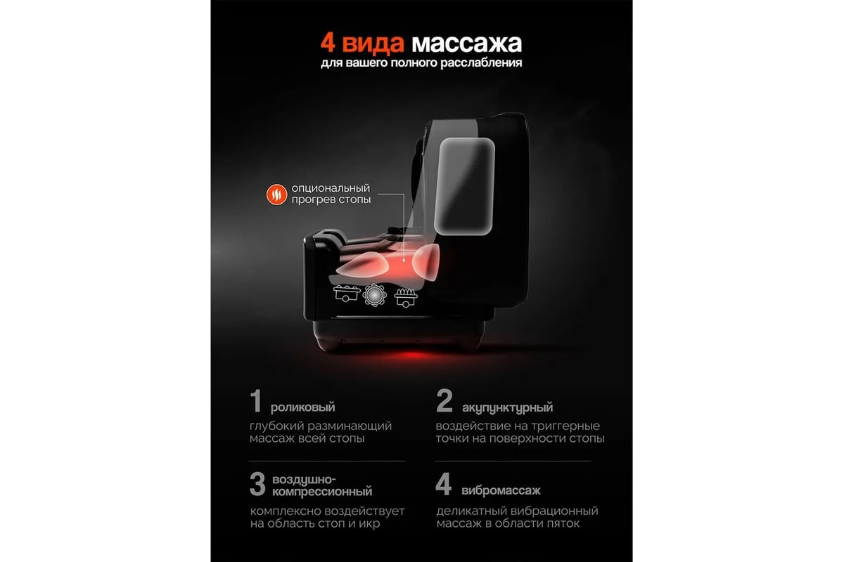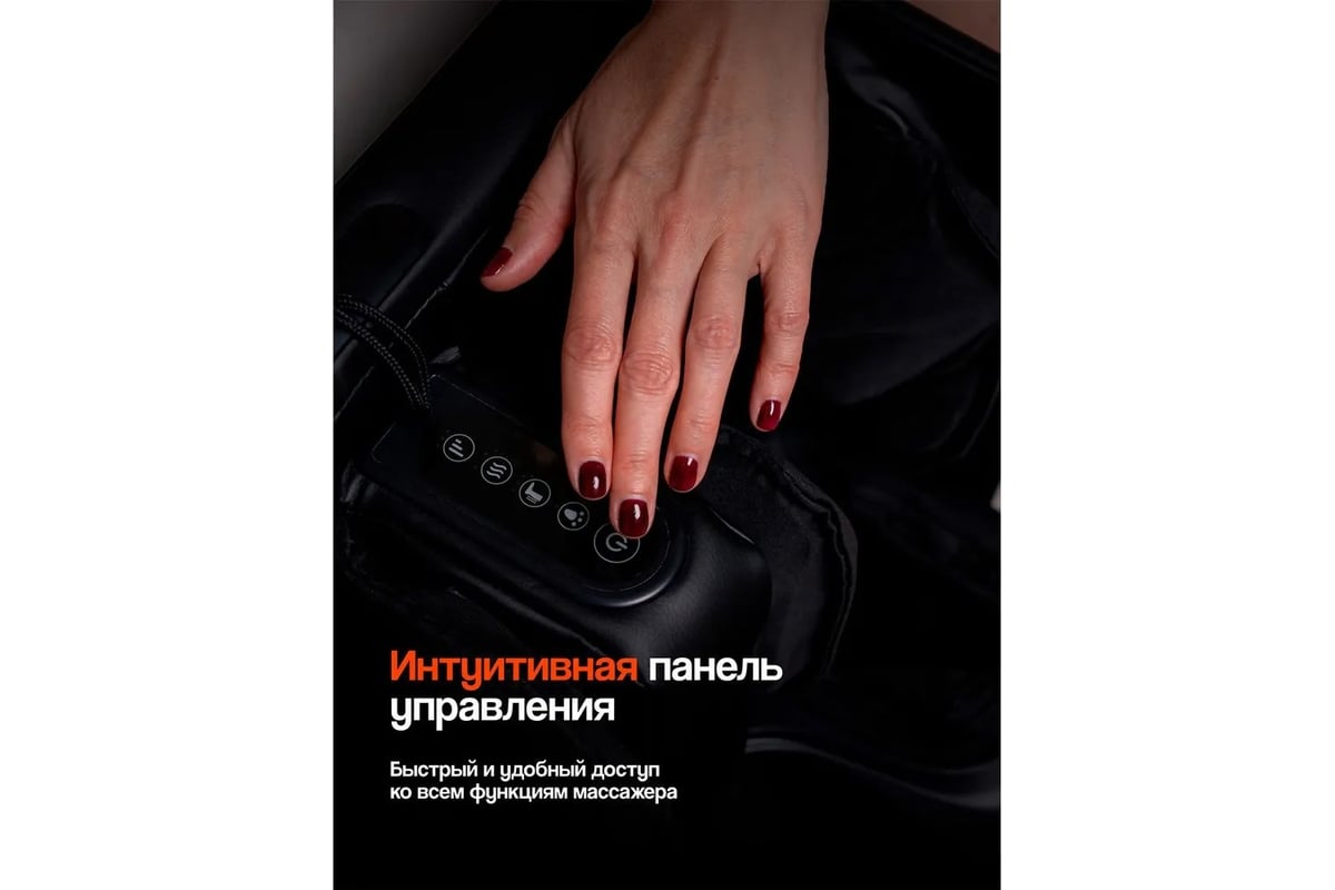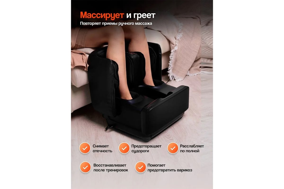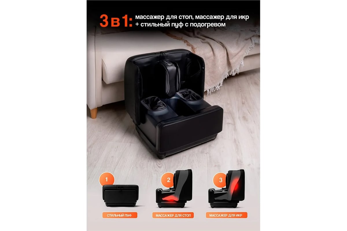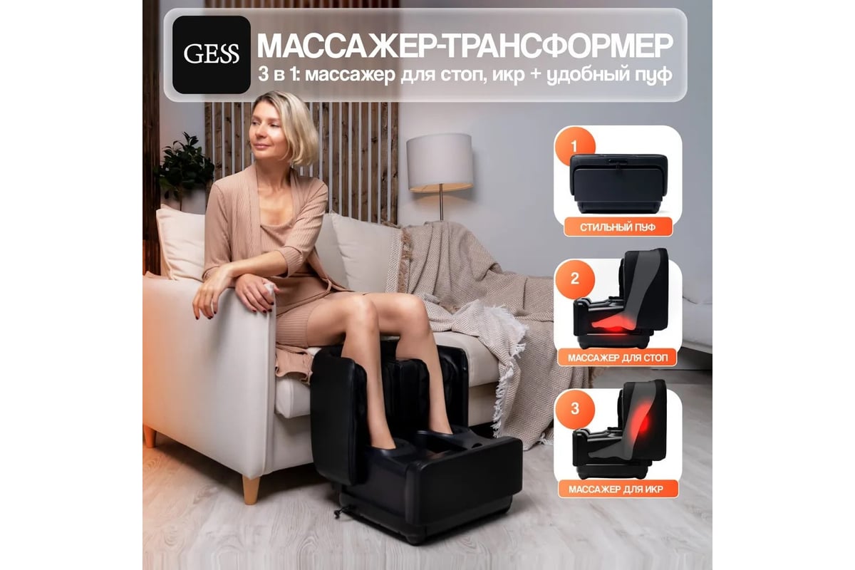 Массажер для ног GESS PUF черный GESS-101 black для стоп и икр для комплексного воздействия на ноги. Способствует снятию напряжения в мышцах, прорабатывает все важные акупукнтурные точки. Массажер для ног в сложенном виде имеет форму пуфика, он не будет выделяться, его можно хранить на видном месте и использовать как отдельный предмет интерьера. Объединяет в себе три важных функции: массаж стоп, лимфодренаж и удивительно удобное место для отдыха. Массажер для ног с несколькими видами массажного воздействия: роликовый, акупунктурный, воздушно-компрессионный и вибромассаж. Можно отдельно выбрать зоны массажа и настроить интенсивность воздействия. Массаж осуществляется воздушными подушками, акупунктурными аппликаторами и массажными роликами. У массажера PUF 5 автопрограмм, позволяющих выбрать именно тот вариант, который подходит в данный момент. Электрический массажер позволяет эффективно проработать стопы, глубоко промассировать икры, снять неприятные ощущения в ногах после длительного стояния или сидения. По желанию можно включить прогрев стоп или сидения (в сложенном виде). Это позволит сидеть на теплом пуфике, когда не используются массажные функции. Панель управления находится на корпусе прибора, что обеспечивает легкий доступ и настройку параметров массажа. Комплексное воздействие массажера способствует общему улучшению организма. Регулярные сеансы массажа способствуют улучшению сна, настроения и повышению общего тонуса. Подходит до 45 размера стоп.