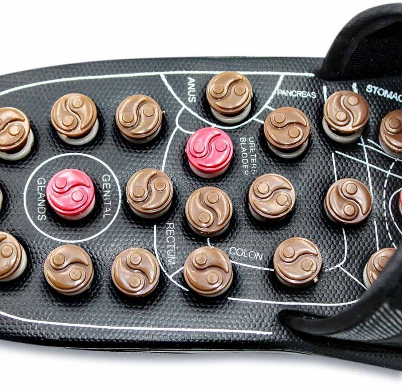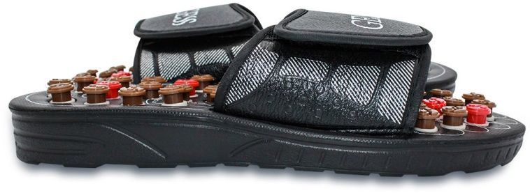 Массажер для стоп в виде тапочек для акупунктурного массажа, с регулируемой полнотой стопы. Массаж осуществляется пружинящими кнопками, которые при надавливании проворачиваются и массируют определённую точку. Препятствуют образованию солевых отложений и появлению натоптышей и шпор.