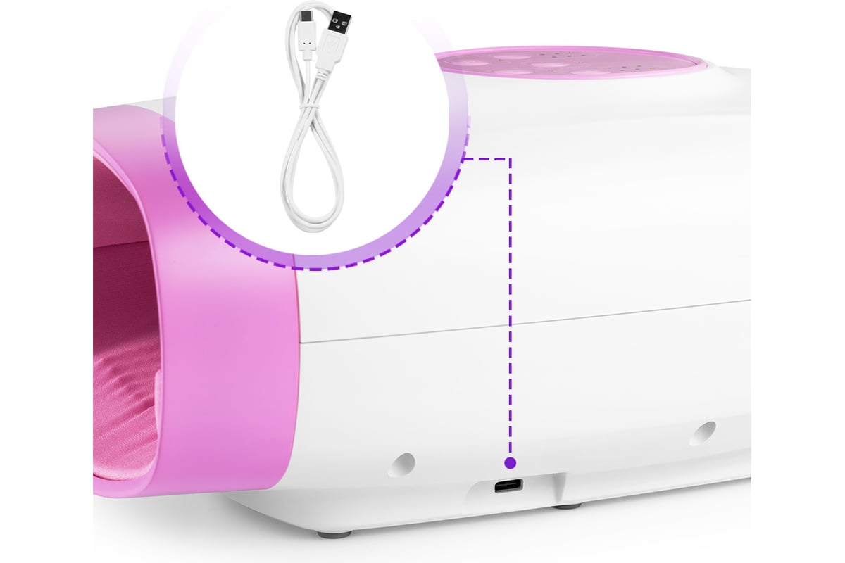В комплект к устройству входит шнур для зарядки USBType-C, с помощью которого вы можете зарядить массажер от розетки, используя адаптер, от компьютера или внешнего аккумулятора, который можно брать с собой в любое место. Время автономной работы составляет 4 часа при использовании массажера для рук без режимов «Вибрация» и «Подогрев».