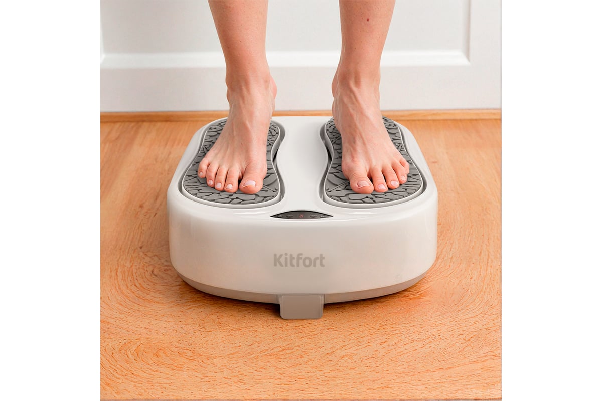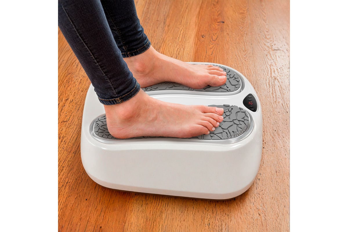 Массажер для ног выполнен в форме платформы с двумя подкладками для ног. Массаж следует делать сидя, так как массажер выдерживает нагрузку до 30 кг. Прорезиненные ножки массажера не дают ему скользить по полу.