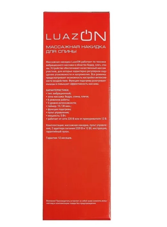 Массажная накидка для спины LuazON LEM-22 работает от сети 220 – 240 В (~) или прикуривателя 12 В по технике вибрационного массажа в областях бедер, плеч и спины. Имеет 8 режимов работы при 3 уровнях интенсивности. Оснащена таймером 15/30 секунд. Есть функция подогрева.