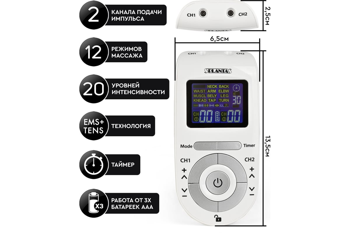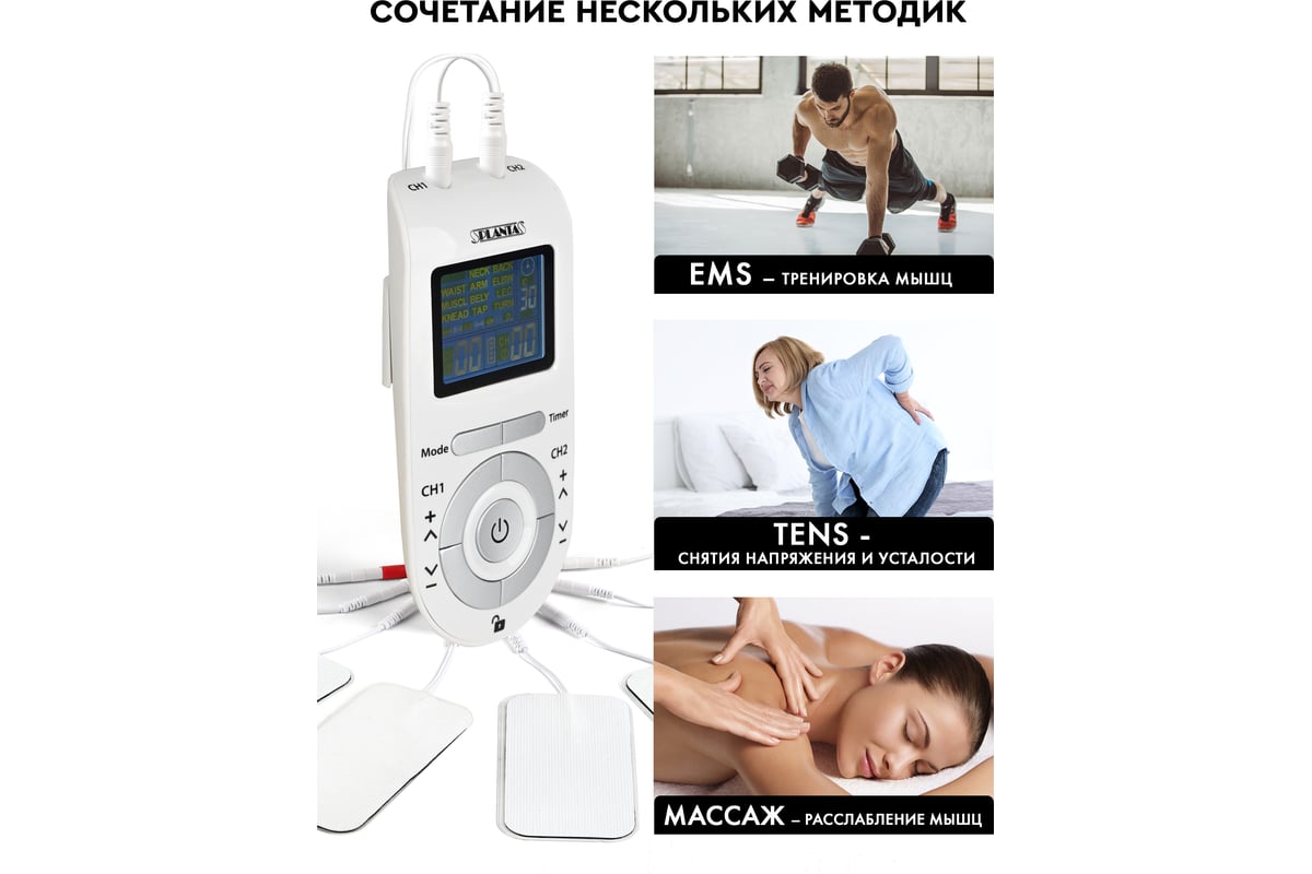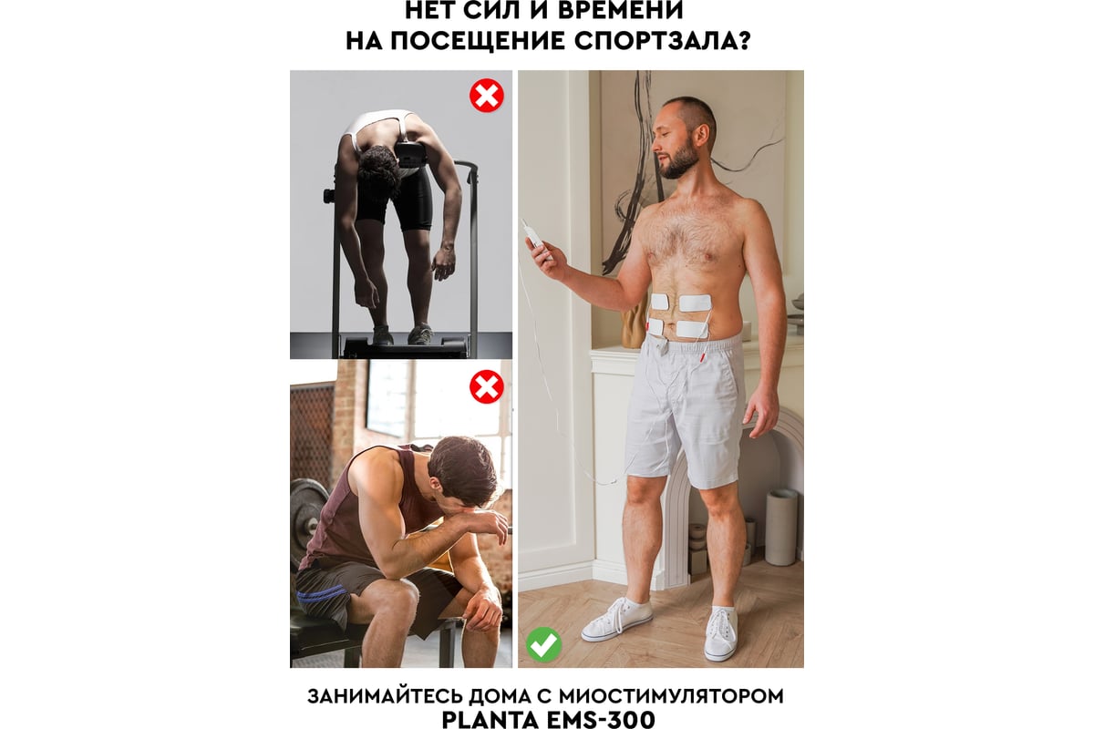 Массажер-миостимулятор для тела Planta EMS-300 – универсальный портативный электростимулятор для тела, тренажер для пресса и массажер для поясницы, спины, шеи. 12 программ сочетают сразу две эффективные методики – электромиостимуляции (EMS) и электронейростимуляции (TENS).