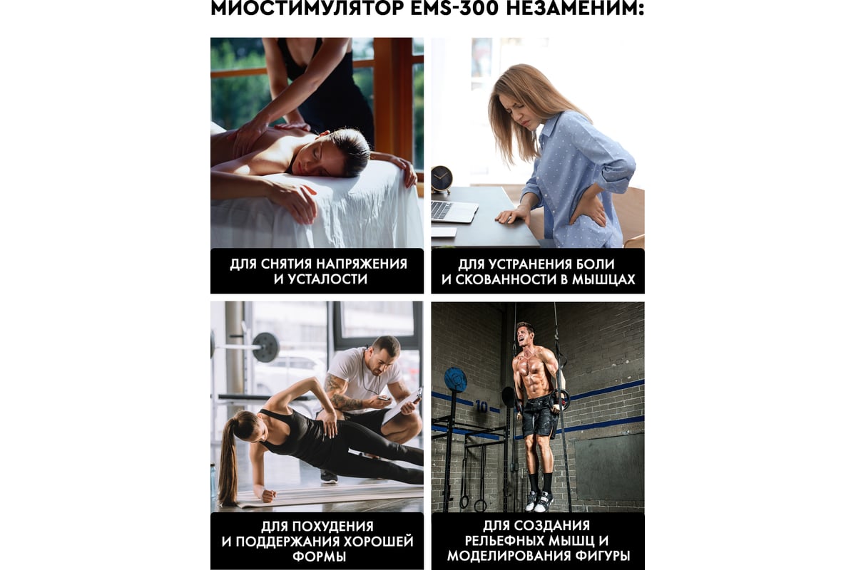 Регулярное применение миостимулятора способствует: устранению стресса и усталости, снятию эмоциональной нагрузки, избавлению от скованности и тяжести в мышцах при повышенных физических нагрузках или наоборот при малоподвижном образе жизни и сидячей работе, устранению застойных явлений и улучшению кровообращения, восстановлению после травм и заболеваний, повышению выносливости. Благодаря универсальности и большому диапазону регулировки интенсивности (20 уровней) миостимулятор заменит многие тренажеры для спорта.