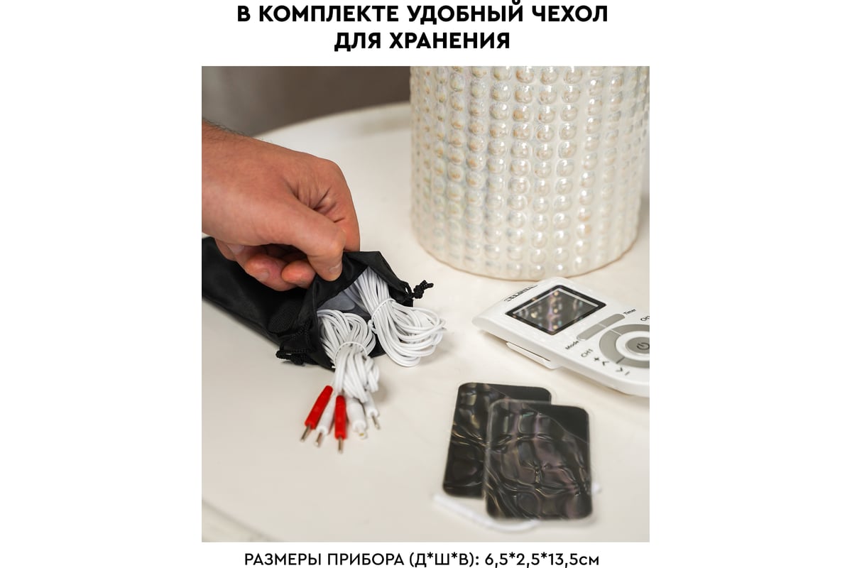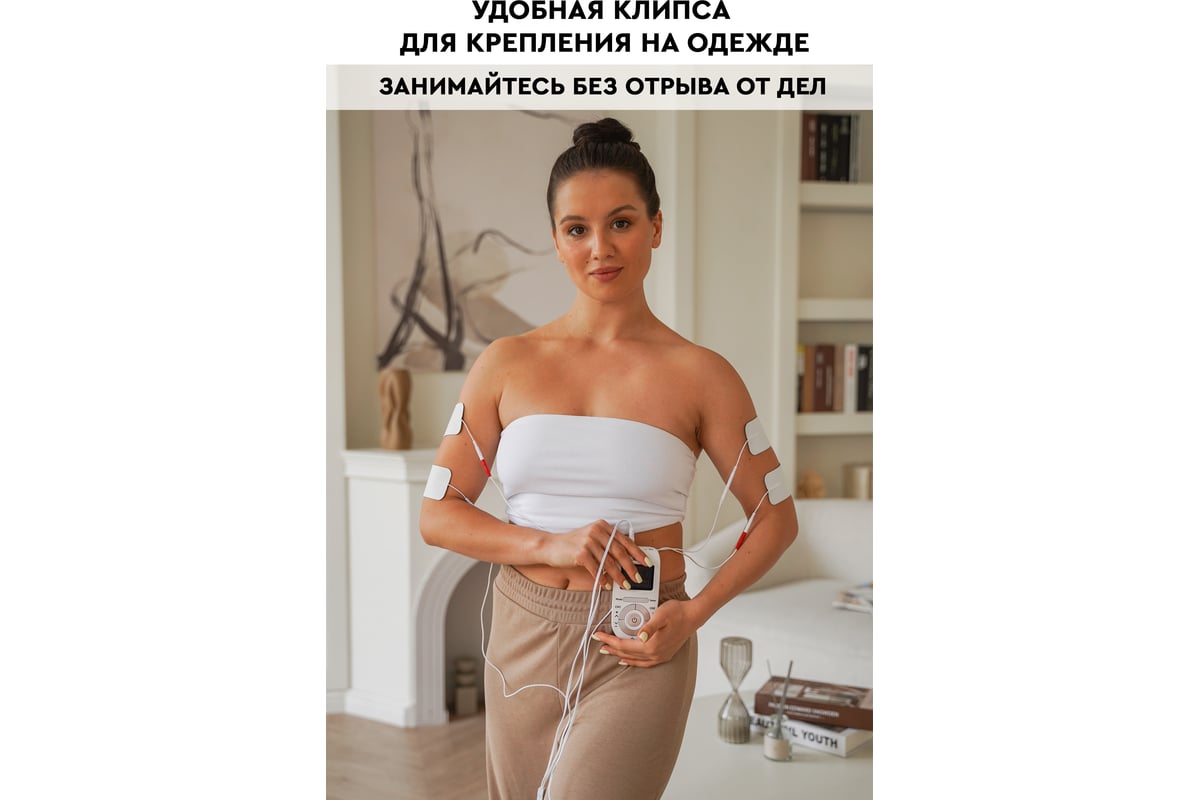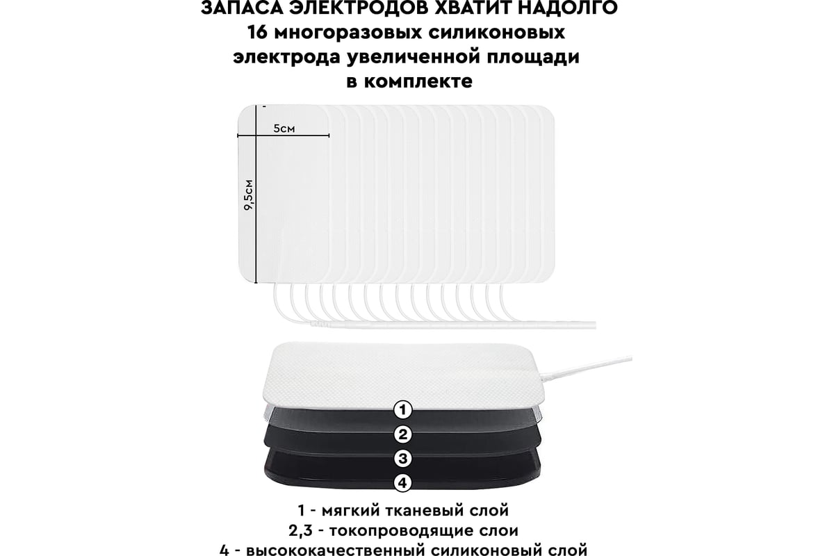 В комплекте сразу 16 сменных электродов. Силиконовые электроды многоразовые и не требуют при применении гель для миостимуляции – просто отклейте защитные пленки и прикрепите электрод к выбранному участку тела – и можно начинать тренировку. Удобная клипса для крепления миостимулятора к одежде и сумочка для хранения. Работа от 3х батареек ААА (не входят в комплект).