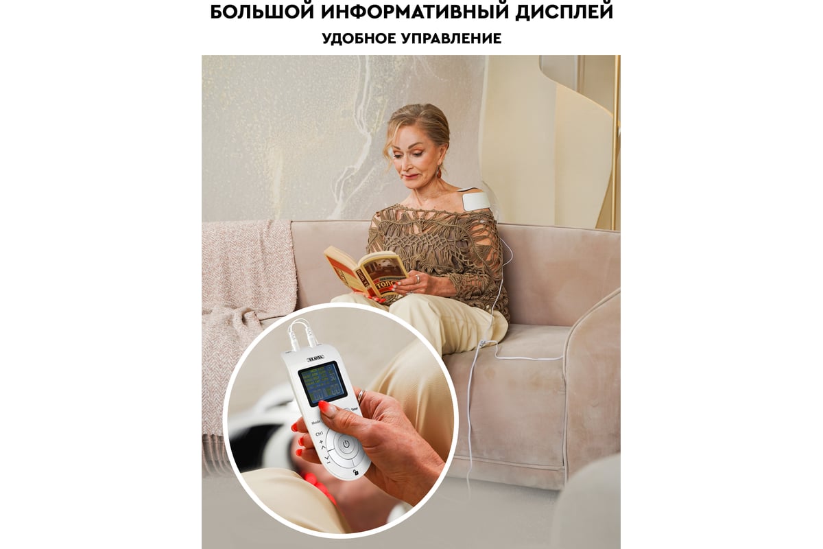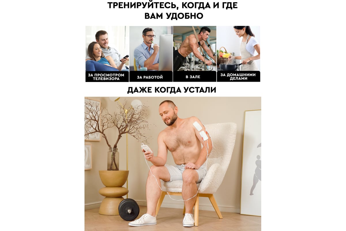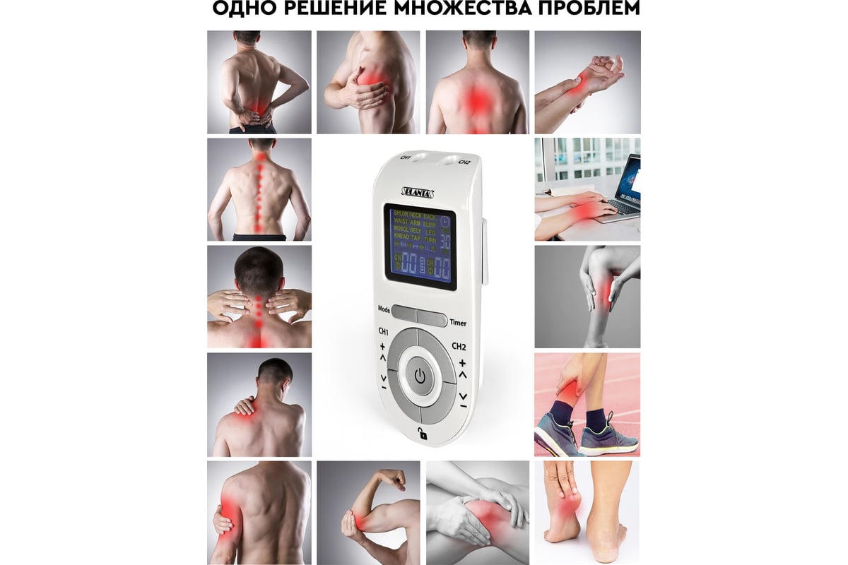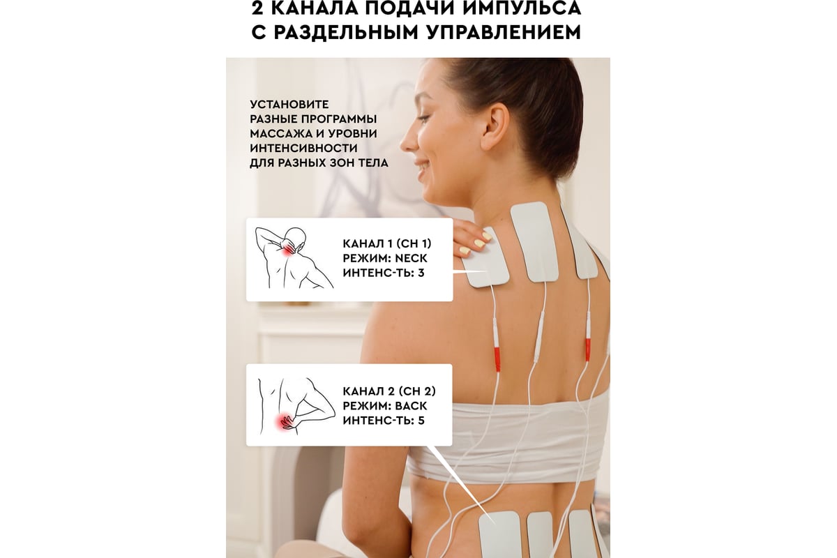 Миостимулятор подает импульсы через 2 канала, к которым можно подключить одновременно 8 электродов. Раздельное управление каналами подачи импульса дает возможность устанавливать различные программы для разных зон тела, т.е., например, использовать миостимулятор одновременно и как миостимулятор для пресса, и получать массаж электрический в области шеи и плеч.