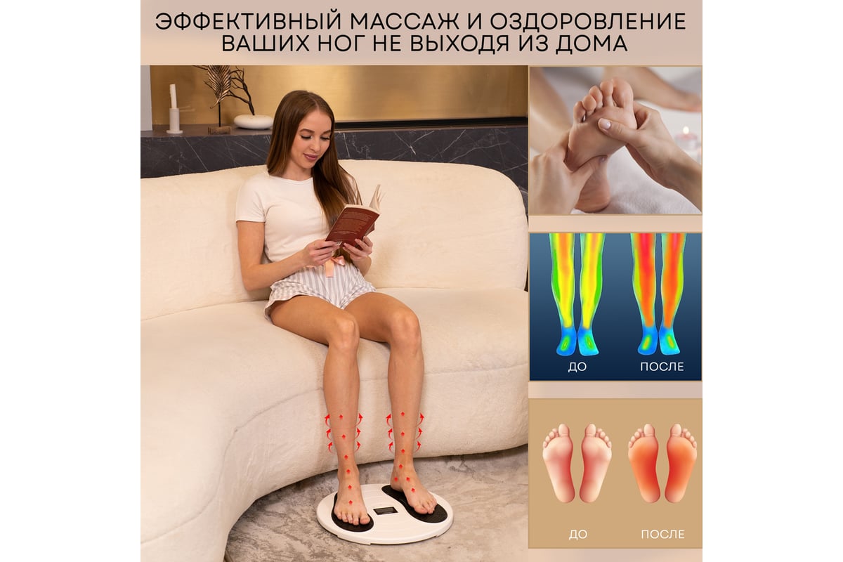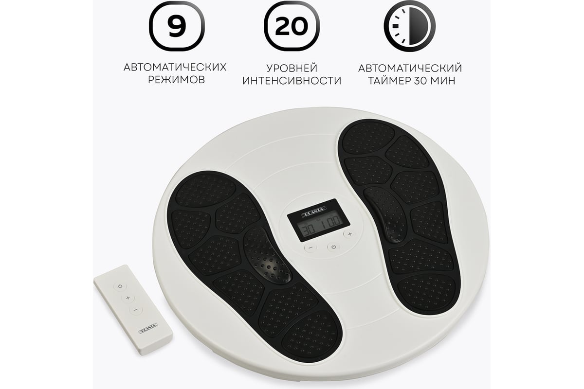 EMS-платформа имеет устойчивое основание с встроенными электродами, что позволяет легко и комфортно отдыхать ступням во время использования устройства. Электростимулятор имеет 9 авторежимов массажа и 20 уровней его интенсивности. В комплекте с массажером имеется пульт управления, который позволяет с легкостью менять режим работы, а встроенный таймер автоматически отключит прибор через 30 минут с начала работы.