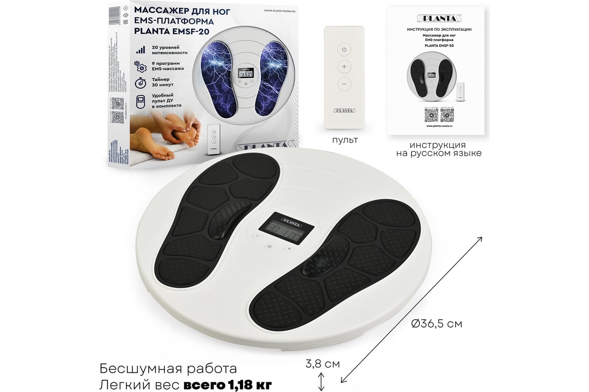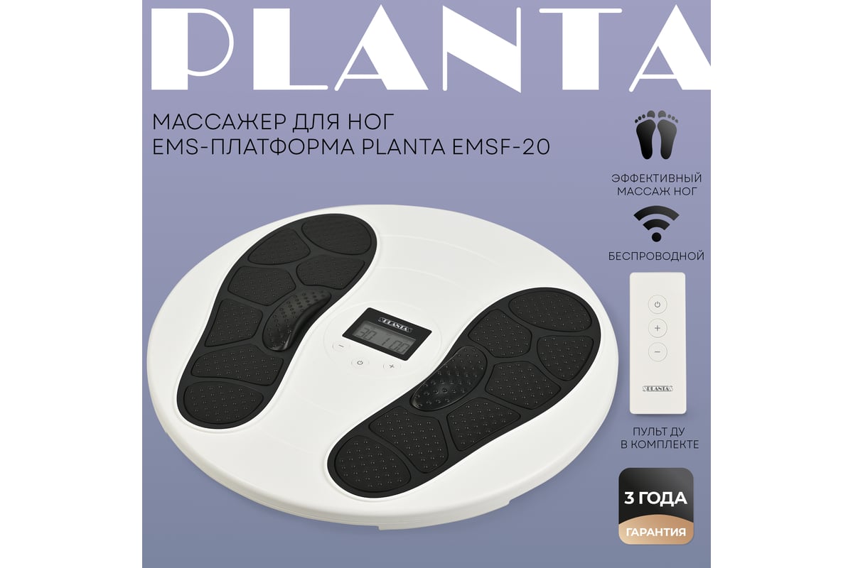 Массажер для ног EMS-платформа PLANTA EMSF-20 - это инновационный портативный электростимулятор, разработанный специально для стимуляции кровообращения в стопах и ногах, устранения тяжести и напряжения в стопах и голенях и для борьбы с застойными явлениями. Миостимулятор стимулирует кровообращение, позволяют максимально расслабить мышцы, ускоряют метаболизм, а также способствуют оттоку лимфы, избавляя от боли в ногах, улучшая общее состояние всего организма.