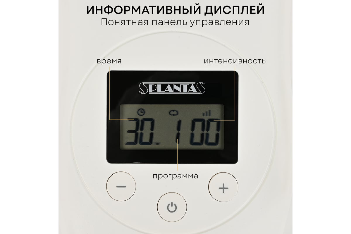 Платформу для массажа ног оснащена понятной панелью управления с информативным дисплеем, отображающим выбранные программу и уровень интенсивности, а также время, оставшееся до окончания массажа.