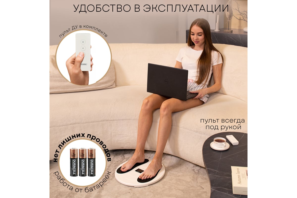 Массажер для ног EMS-платформа, благодаря работе от 3-х батареек типа АА, имеет преимущество беспроводного использования в домашних условиях, на работе, в дороге.