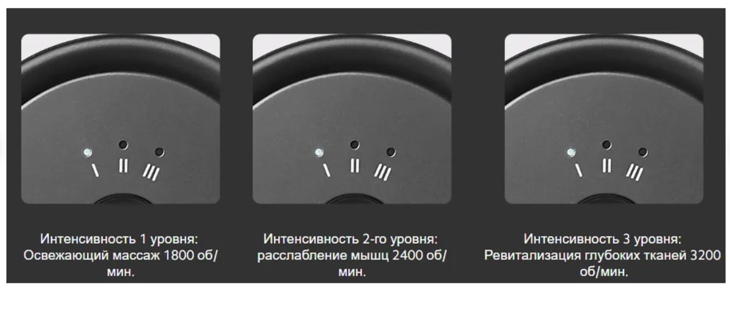 В комплект входят 3 различные насадки для воздействия на различные группы мышц.