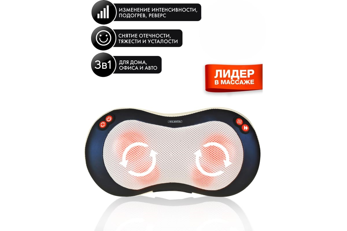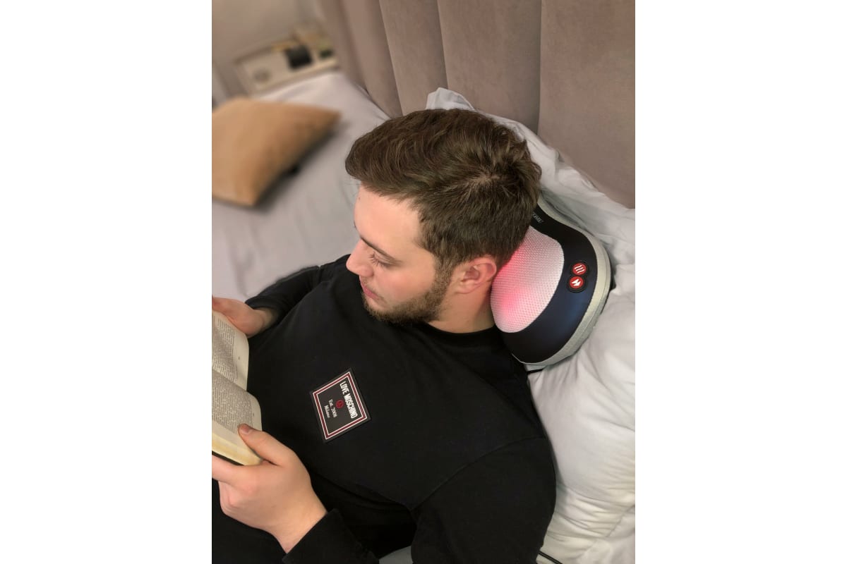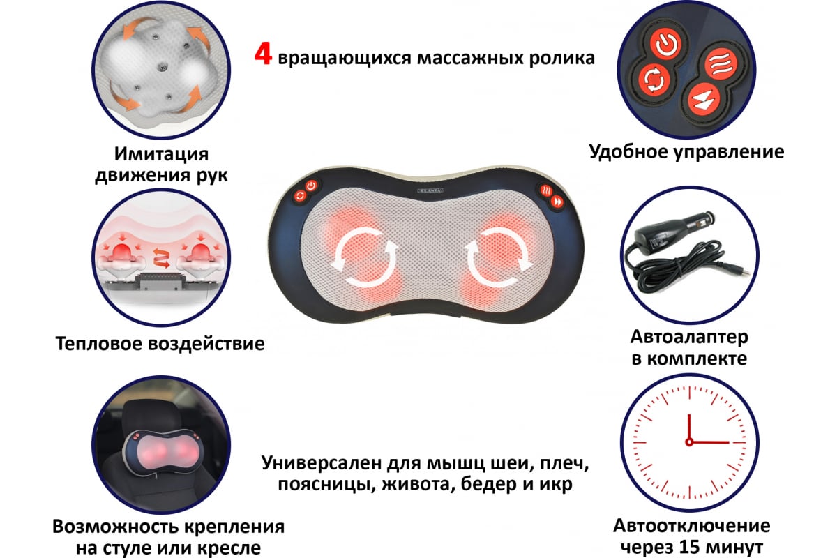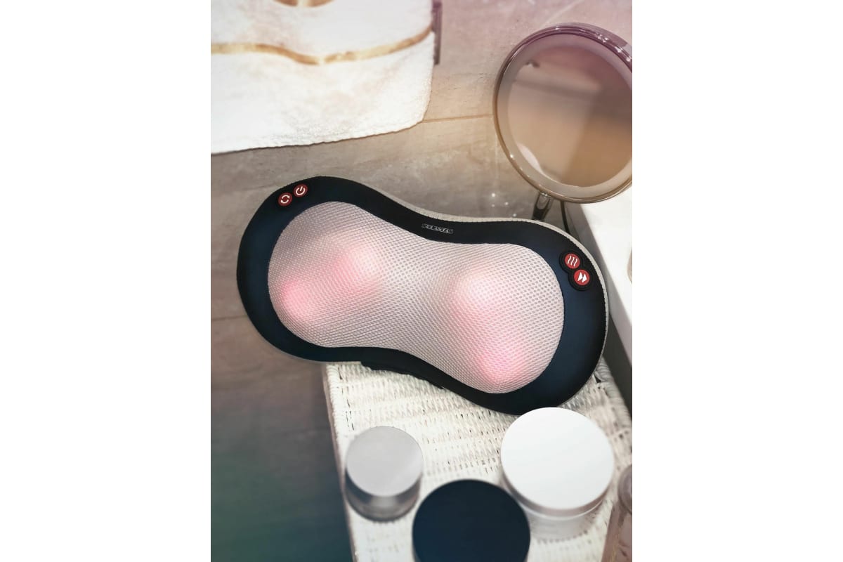 Благодаря мощному мотору и улучшенному роликовому механизму, состоящему из 4-х вращающихся во встречных направлениях массажных головок с функцией подогрева, подушка воздействует на акупунктурные точки, обеспечивая глубокий разминающий массаж Шиацу и быстрое снятие напряжения в любых частях тела: шее, плечах, пояснице, ступнях, икрах и бедрах.
