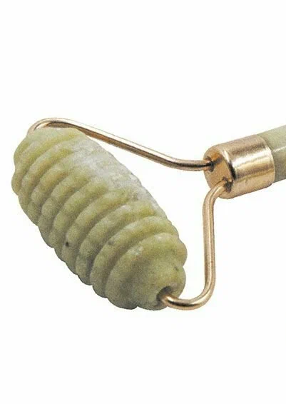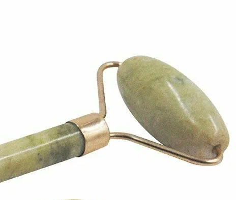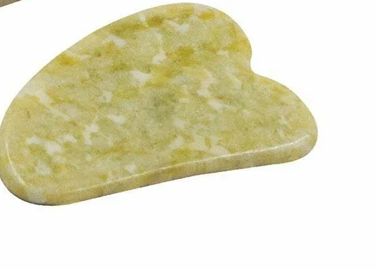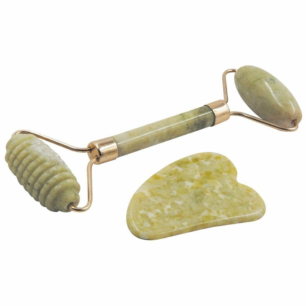 Массажный набор для лица. Материал - высококачественный натуральный камень нефрит с декором "под золото". В набор входят: двусторонний ролик - размер 15х6х4 см; скребок Гуаша - размер 7,3х5 см.