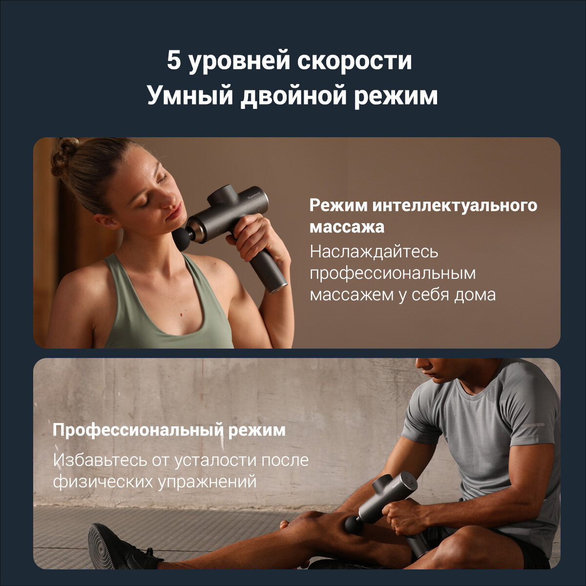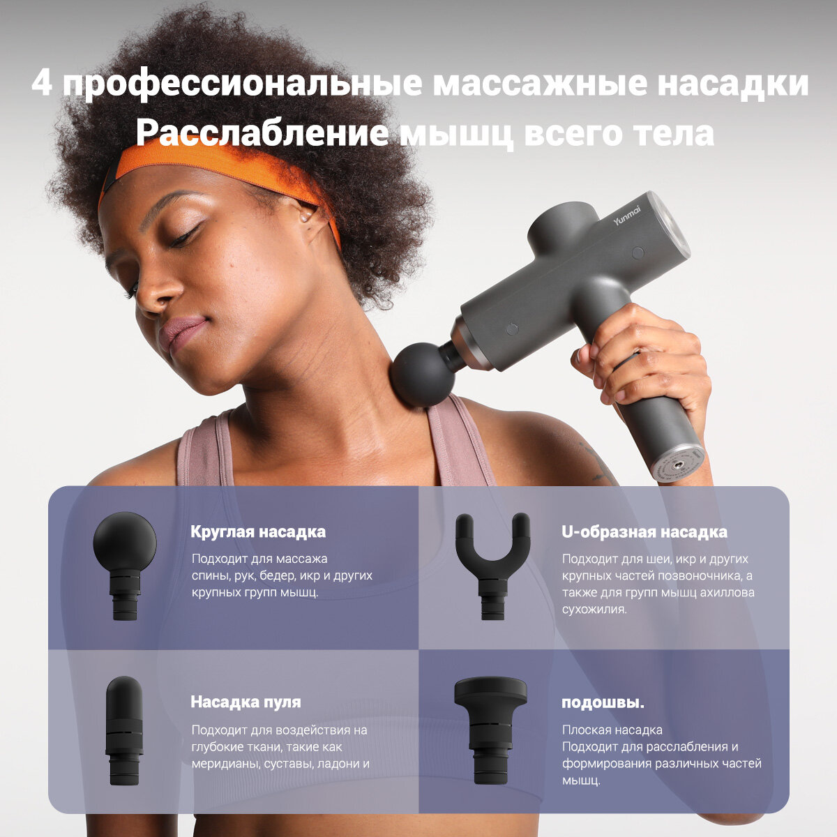 Массажер, зарядная док-станция, насадки: цилиндрическая, сферическая, плоская и U-образная, адаптер питания, кейс для хранения, руководство пользователя