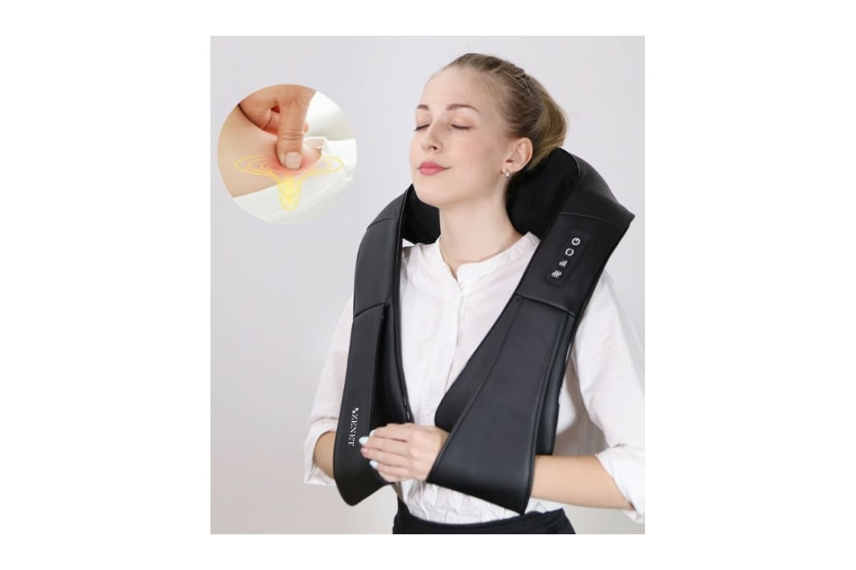 Массажер сделан в виде накидки на плечи и имеет анатомическую форму – повторяет контуры тела.