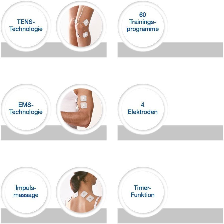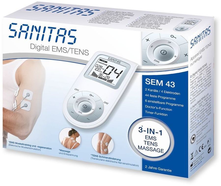 Описание: Электростимулятор 3 в 1: обезболивающее лечение (TENS), стимуляция мышц (EMS), массаж. 30 запрограммированных вариантов применения 20 свободно программируемых программ (частота, длительность импульса). Количество выходов 2. 4 самоклеющихся электрода (45×45 мм). Защитное отключение.