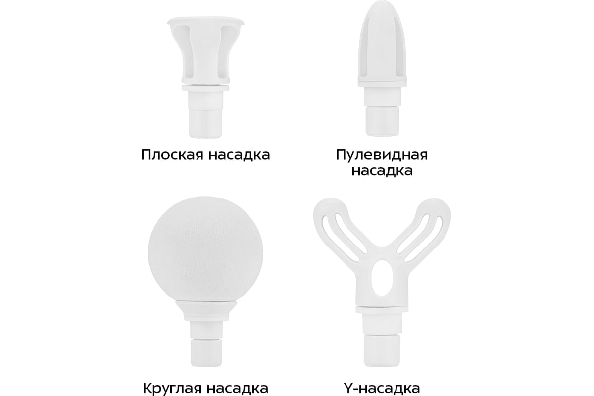 Насадки разных видов предназначены для воздействия на группы мышц и отдельные мышцы. Пулевидная насадка применяется для «разбивания» триггеров, проработки тканей и точечного массажа стоп. Чрезмерное напряжение, резкие движения, растяжения провоцирует возникновение триггерных точек — плотных болезненных узлов в мышцах. Пулевидная насадка действует на проблемные зоны, прорабатывает триггеры и помогает расправить зажатые фасциальные волокна. Y-насадка используется для массажа мышц шеи, трапеции, и мышц вдоль позвоночника. Плоская насадка отлично подходит для широких типов мышц. Круглая насадка более универсальная и подходит почти для любых групп мышц.