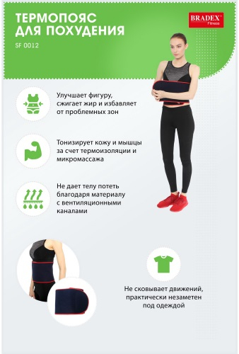 Термопояс для похудения Bradex SF 0012 можно использовать в процессе выполнения повседневных задач, при пробежках, прогулках, во время занятий в спортивном зале. Модель обеспечивает оптимальную термоизоляцию и деликатный массажный эффект, что способствует активному потоотделению и сжиганию подкожного жира. Изделие также защищает поясницу от чрезмерных нагрузок. Трехслойный термопояс изготовлен из неопрена, лайкры и спандекса. Качественные материалы не подвержены растяжению и разрыву, поэтому надолго сохраняют эксплуатационные свойства. Пояс не требует особого ухода, застегивается посредством липучки. Размер модели регулируется в диапазоне до 110 см.