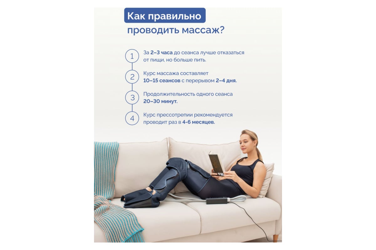 Один сеанс прессотерапии сопоставим с 20 процедурами ручного массажа. Компрессионный массажер для ног оснащён функцией инфракрасного прогрева, которая усиливает эффективность процедуры.