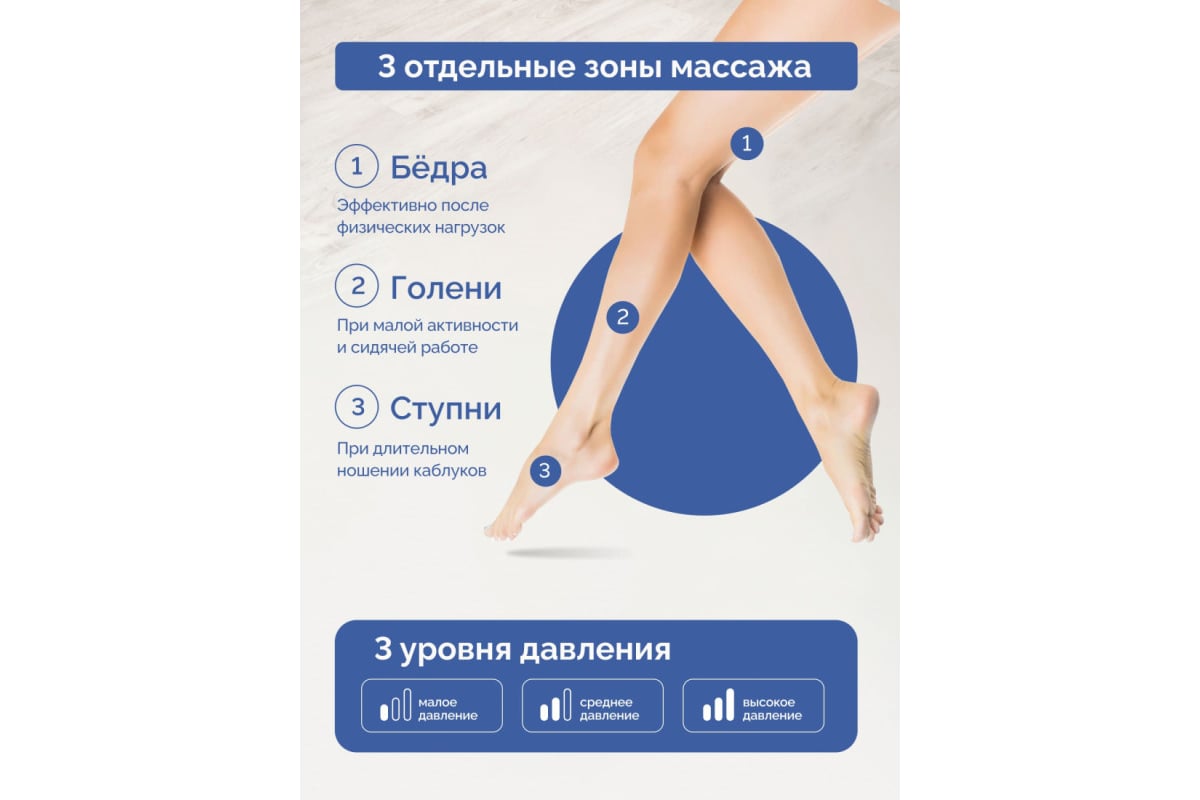 Лимфодренажный массажер выполняет воздушно-компрессионный массаж стоп, икр, бёдер и решает большинство проблем с ногами: устраняет судороги в икрах, отёки, целлюлит, ломоту, усталость, дискомфорт в мышцах.