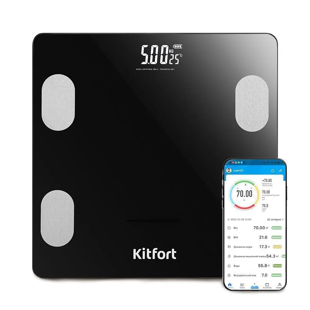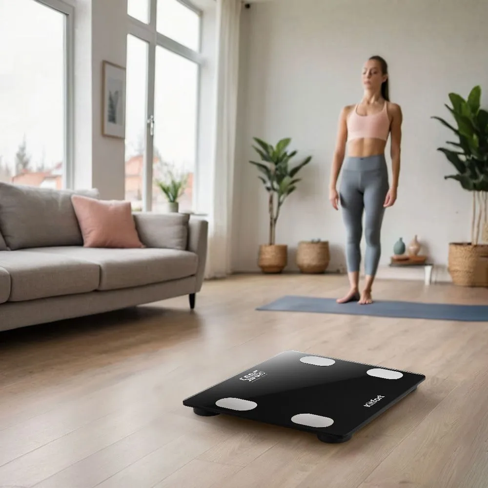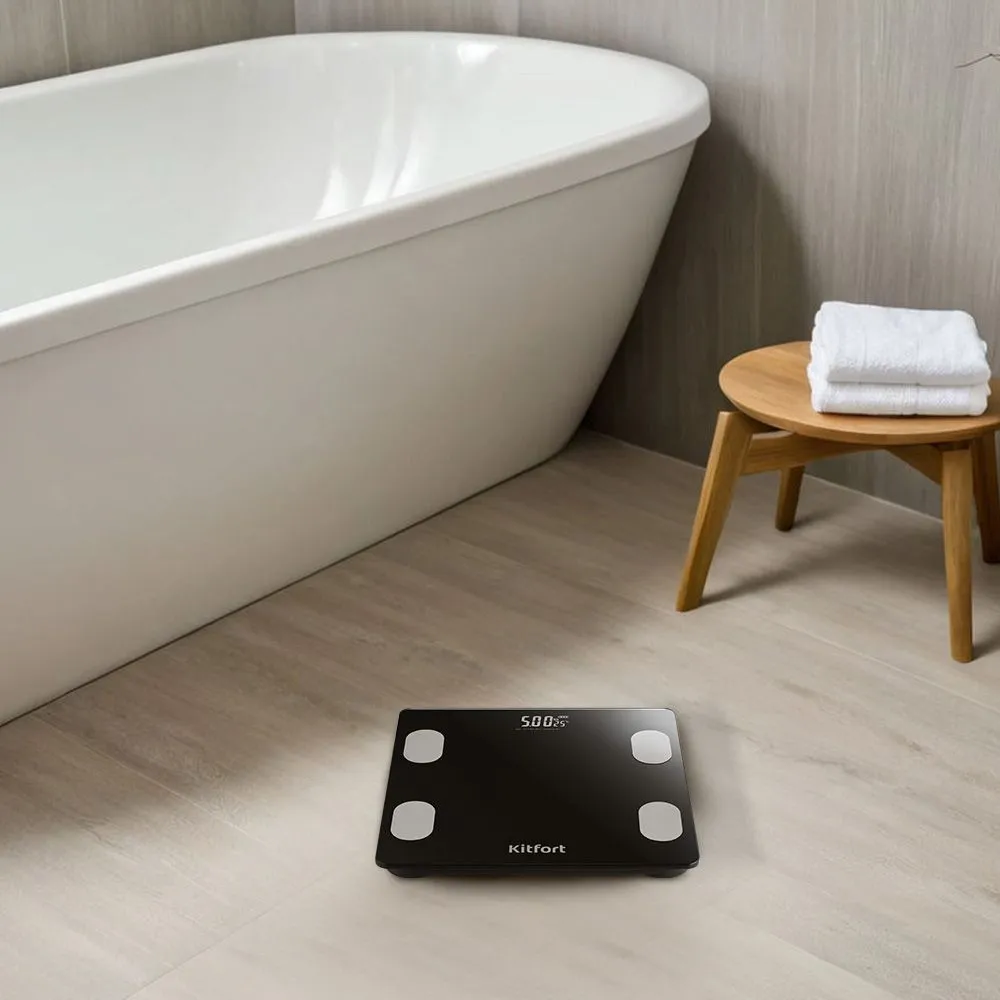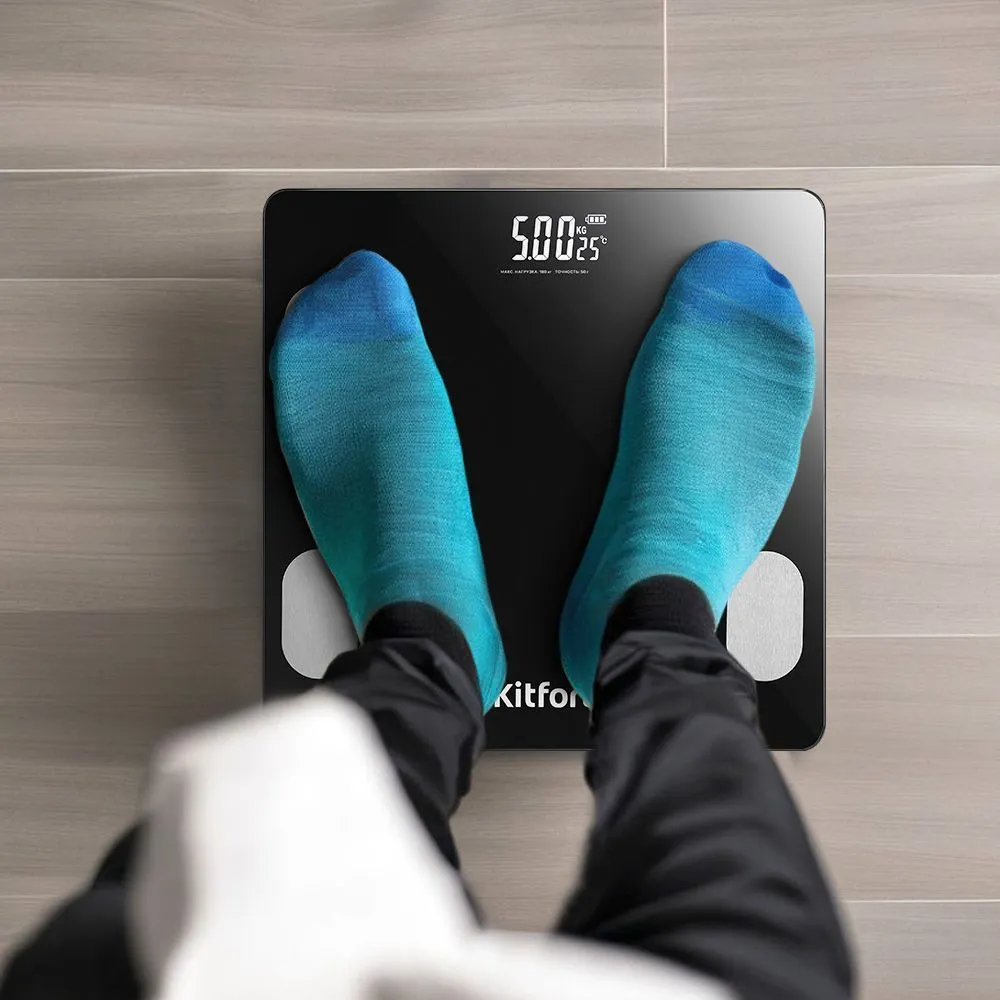 Весы можно подключить к приложению OKOK International, включив передачу данных через Bluetooth. Приложение выводит разные параметры биоимпедансного анализа: индекс массы тела, мышечную массу, процентное содержание воды и жира в организме и т.д.