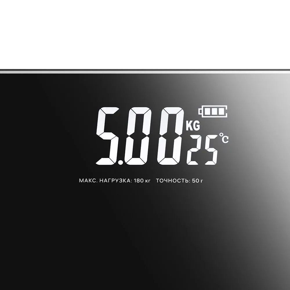 Весы оснащены жидкокристаллическим дисплеем с крупным отображением цифр, что делает их использование максимально удобным. На дисплее также отображается индикатор заряда батареек и температура в помещении.