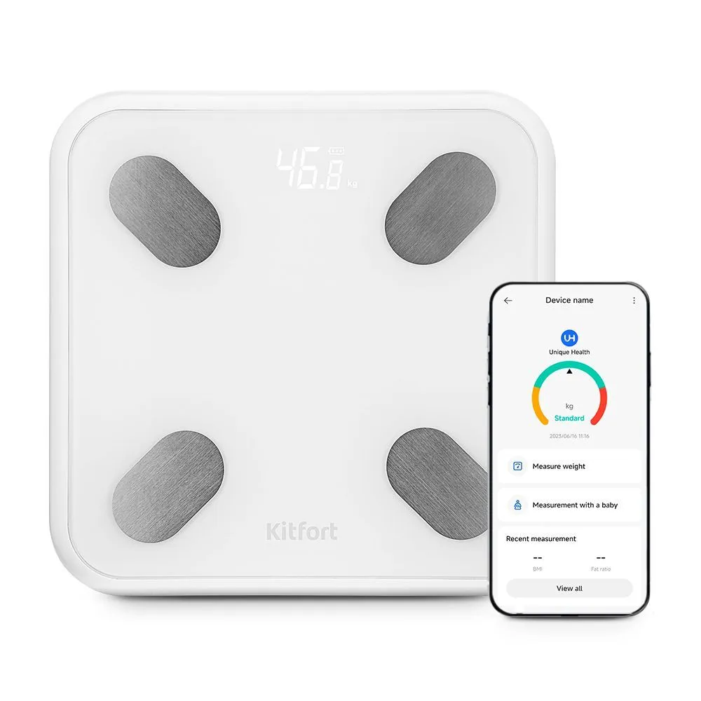 Весы КТ-846 представляют современное поколение «умных» весов, поскольку их можно подключить к приложению ОКОК International, включив передачу данных через Bluetooth. Приложение выводит на экран телефона разные параметры биоимпедансного анализа.