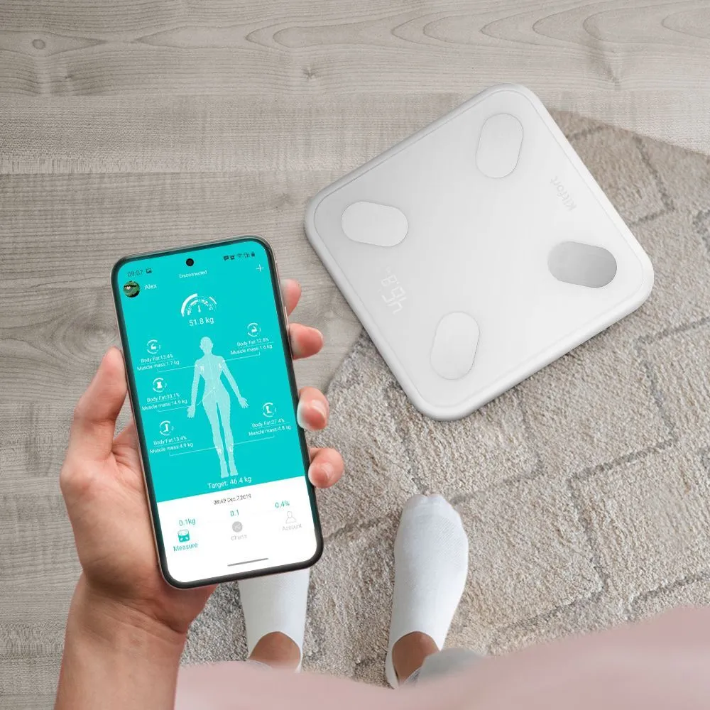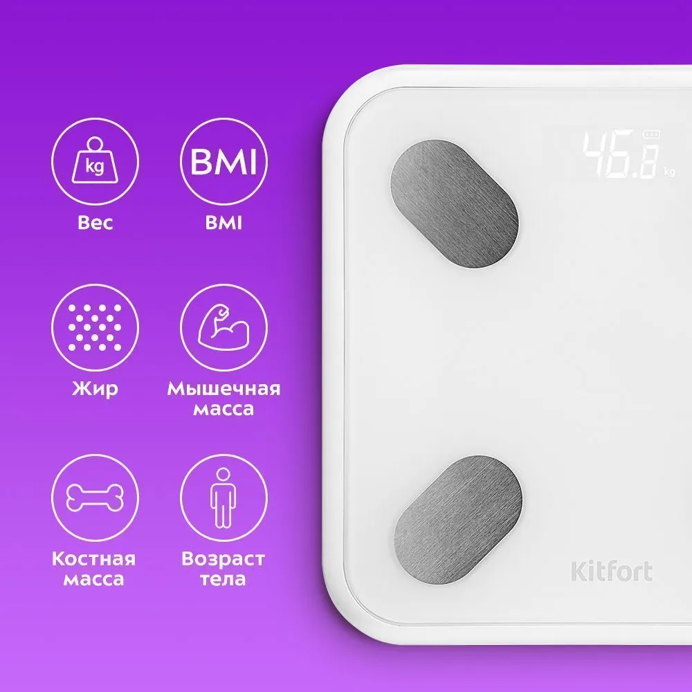 В течение нескольких секунд после взвешивания, в приложении отразятся важнейшие параметры вашего тела. Среди них: вес, возраст тела, содержание воды, белка, жира и костной массы в вашем организме, общий баланс вашего тела и многие другие.