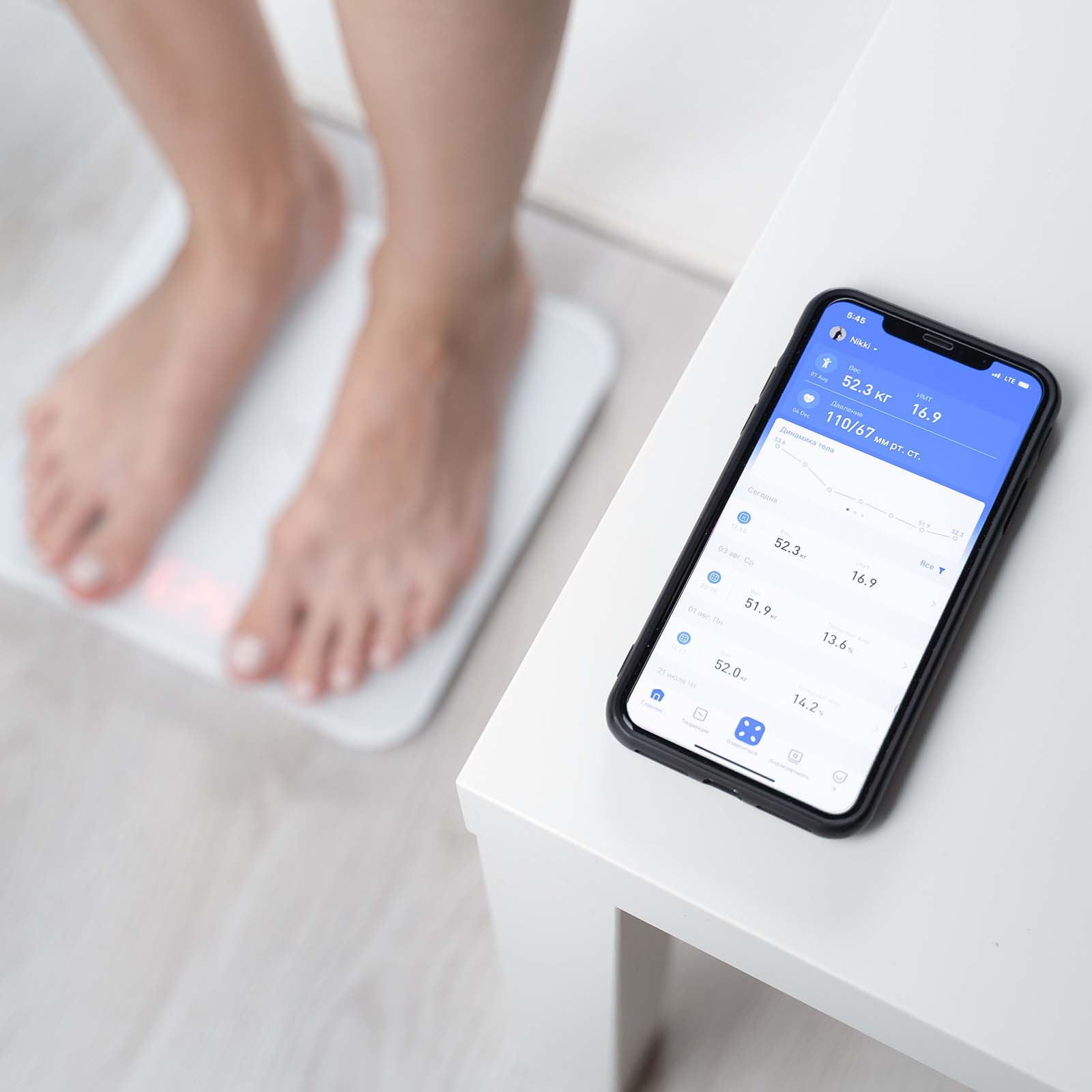 За изменениями веса, индекса массы тела, скорости базового обмена веществ и общей оценкой можно следить в журнале или на удобном графике прямо на главной странице приложения. Оно доступно для iOS и Android. Данные от весов синхронизируются с Apple Health и Google Fit.