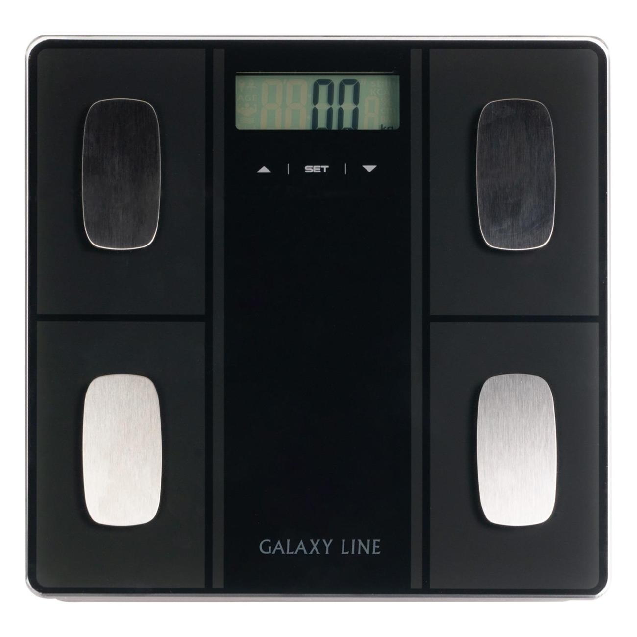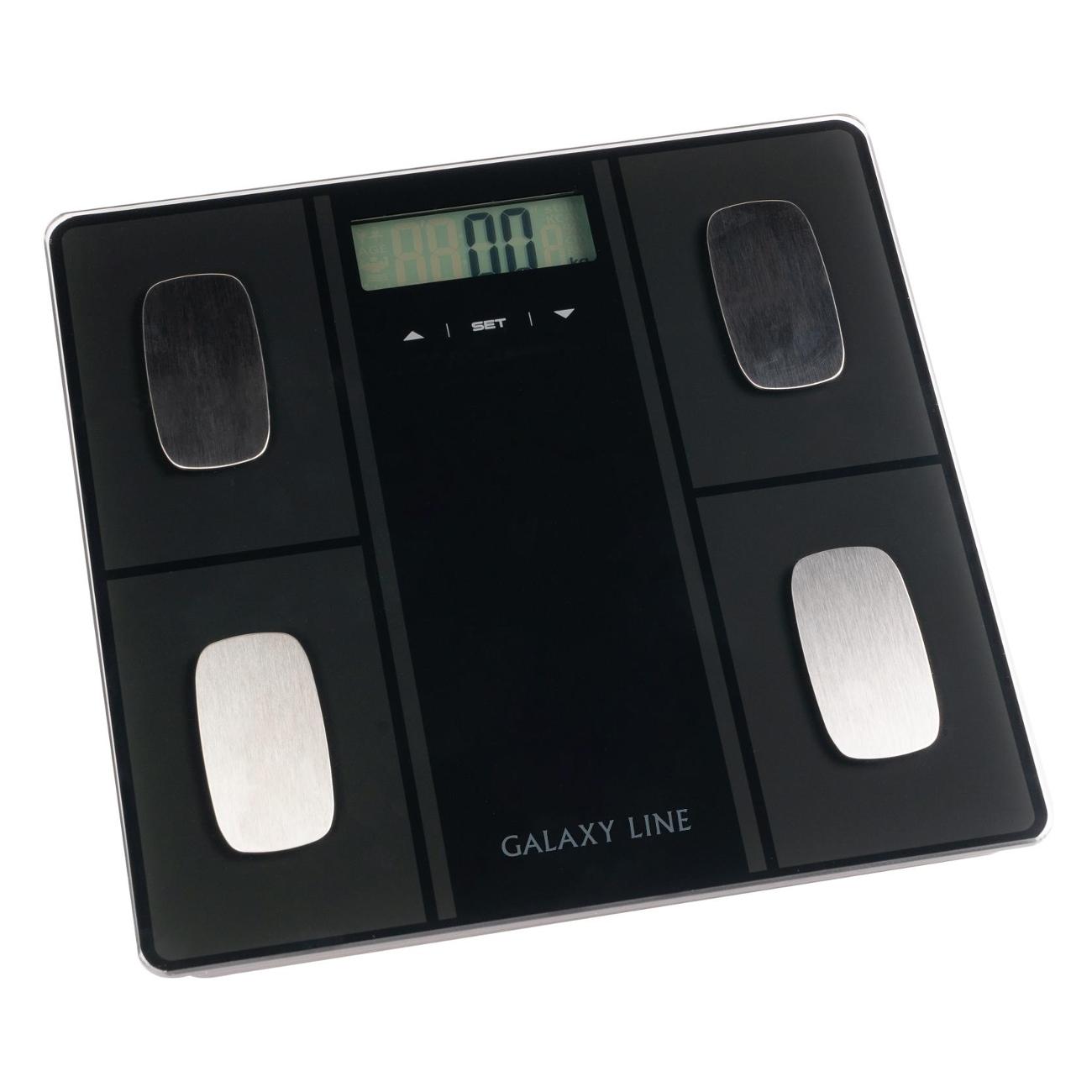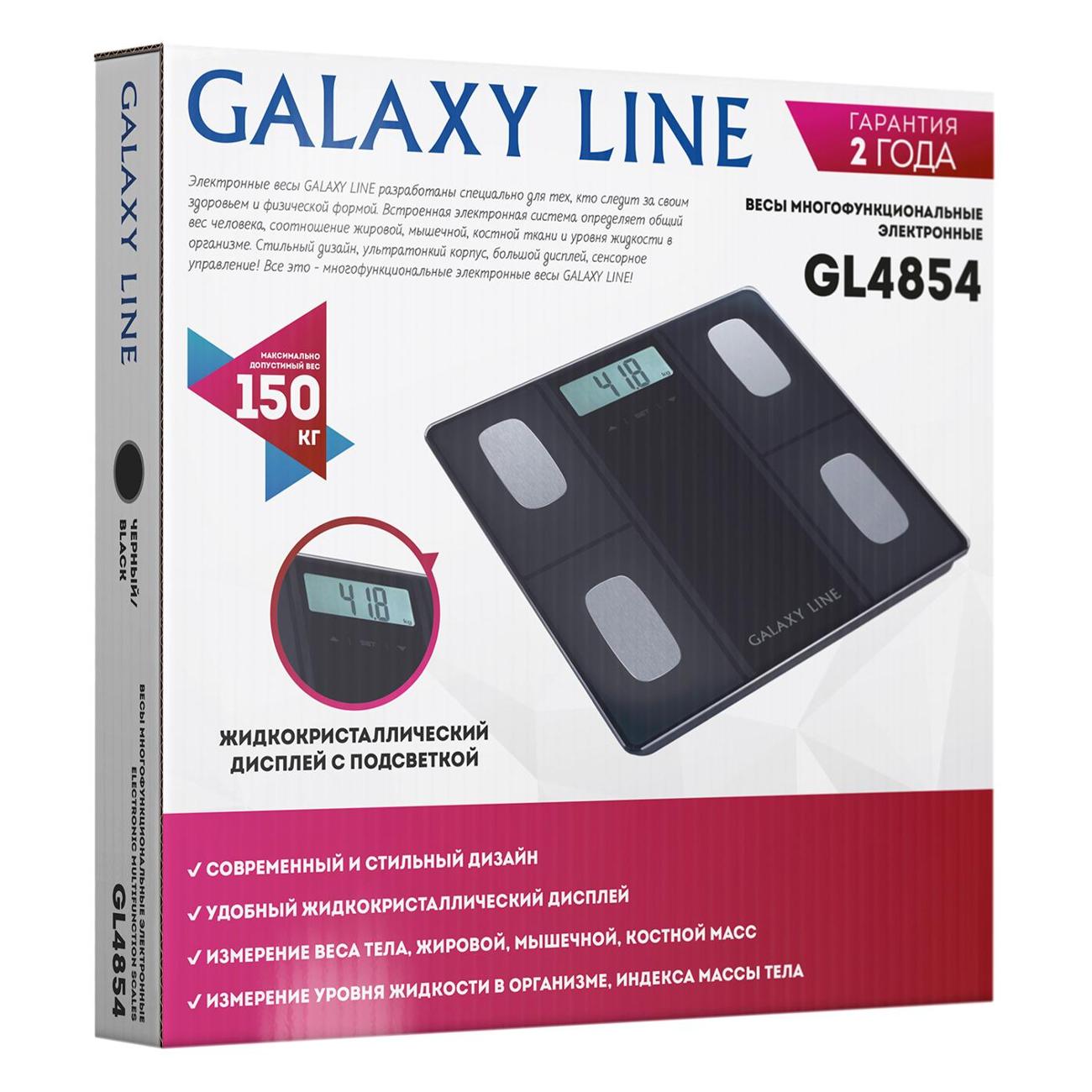 Напольные весы Galaxy Line GL4854 Black имеют ограничение по максимальному весу — 150 кг. Модель оснащена функциями автоматического включения и выключения, измерения уровня подкожного жира, воды в организме, костной и мышечной массы, индекса BMI, расчета ежедневной нормы калорий. На цифровом дисплее отображается информация о массе тела, наличии перегрузки и разрядки батарей. Изделие выполнено из закаленного стекла и дополнено прорезиненными ножками, которые предохраняют от скольжения по поверхности пола. Питание осуществляется при помощи батарей типа ААА.