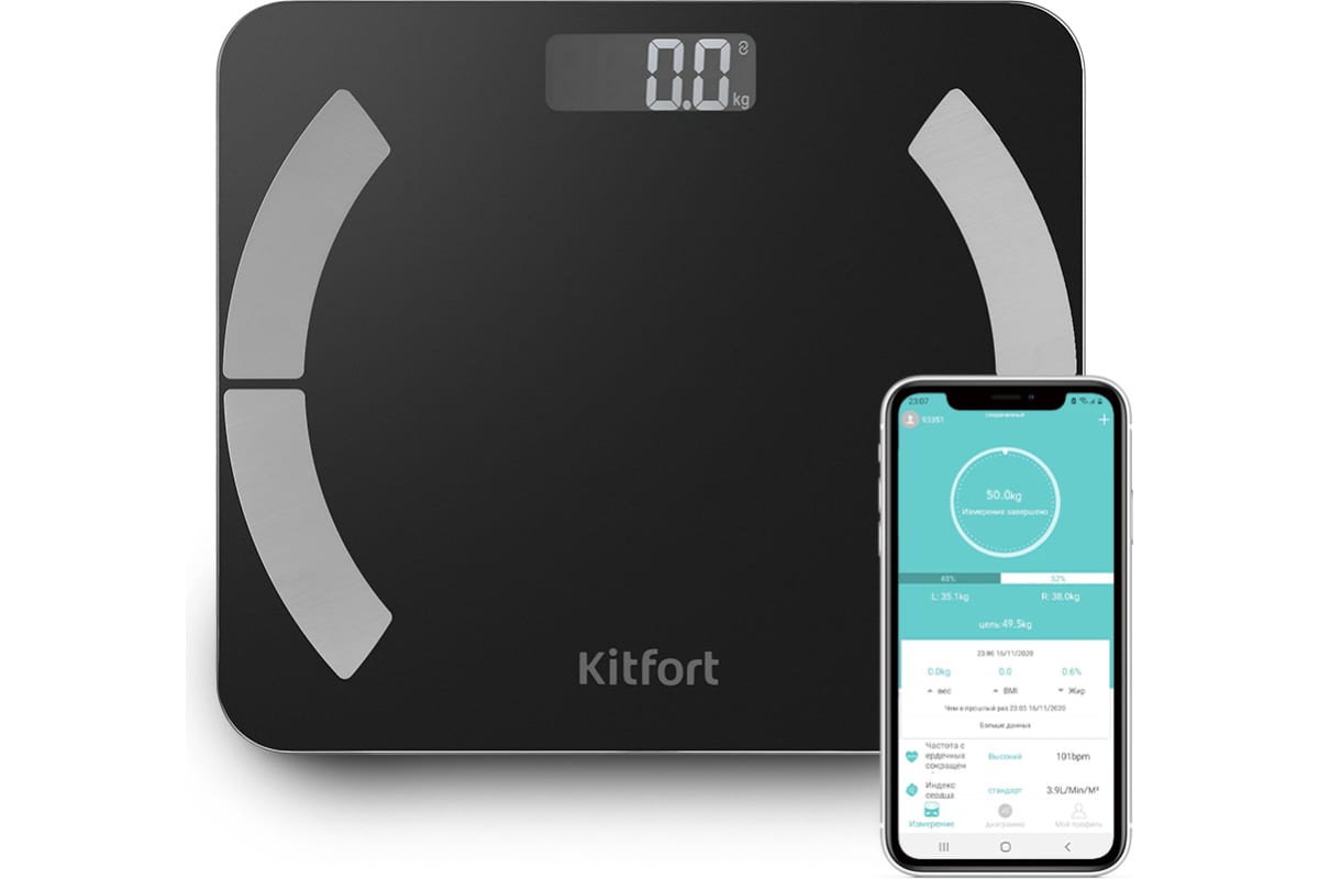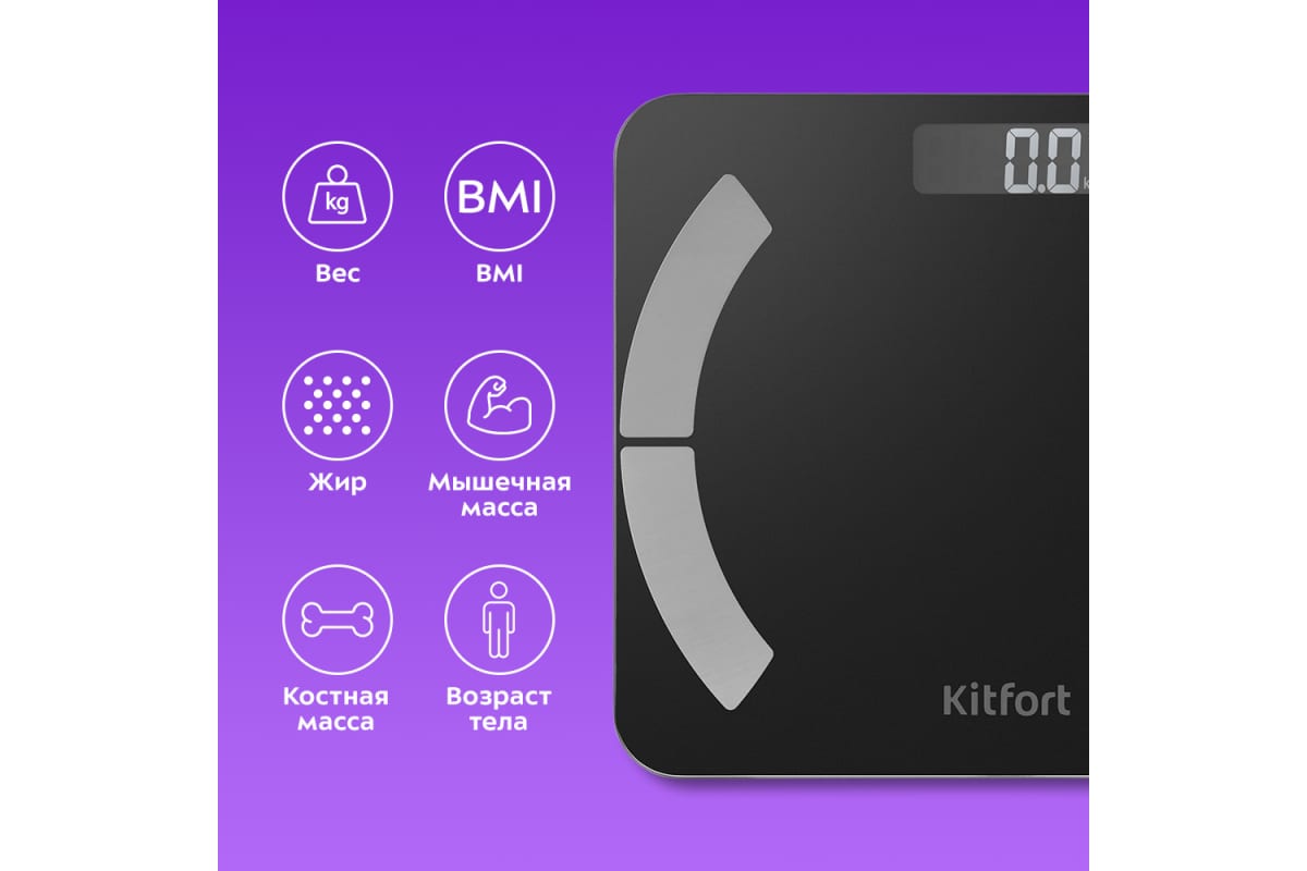Электронные напольные весы обеспечивают высокую точность измерения и станут неизменным спутником для людей, следящих за своим весом. Весы КТ-814 представляют современное поколение «умных» весов, поскольку их можно подключить к приложению Fitdays, включив передачу данных через Bluetooth. Весы оснащены жидкокристаллическим дисплеем с крупными цифрами, что делает их использование максимально удобным. Платформа выполнена из высокопрочного полированного стекла, а прорезиненные ножки обеспечивают дополнительную устойчивость весам и предотвращают их скольжение по полу, что гарантирует безопасность во время взвешивания. Токопроводящие электроды вмонтированы в платформу, они необходимы для проведения биоимпедансного анализа. Биоимпедансный анализ — метод диагностики состава тела человека посредством измерения импеданса — электрического сопротивления участков тела в разных частях организма. Такой анализ считается точным и помогает провести оценку состава тела человека на соответствие принятым нормам. Включение весов происходит автоматически, если встать на них. После взвешивания показания весов фиксируются на дисплее. Мобильное приложение Fitdays выводит на экран телефона разные параметры проведенного анализа: вес, индекс массы тела, мышечную массу, костную массу, баланс тела, висцеральный жир, и т.д. Весы работают от двух батареек типа ААА. Весы имеют стильный и привлекательный дизайн, благодаря чему впишутся в любой интерьер.