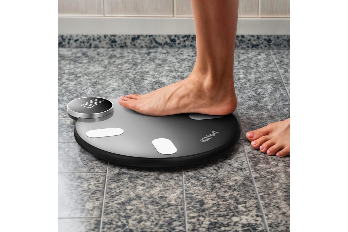 Электронные напольные весы обеспечивают высокую точность измерения и станут неизменным спутником для людей, следящих за своим весом. Весы представляют современное поколение «умных» весов, поскольку их можно подключить к приложению Fitdays, включив передачу данных через Bluetooth. Весы оснащены жидкокристаллическим дисплеем с крупными цифрами, что делает их использование максимально удобным. Платформа выполнена из высокопрочного полированного стекла, а прорезиненные ножки обеспечивают дополнительную устойчивость весам и предотвращают их скольжение по полу, что гарантирует безопасность во время взвешивания. Токопроводящие электроды вмонтированы в платформу, они необходимы для проведения биоимпедансного анализа. Биоимпедансный анализ — метод диагностики состава тела человека посредством измерения импеданса — электрического сопротивления участков тела в разных частях организма. Такой анализ считается точным и помогает провести оценку состава тела человека на соответствие принятым нормам. Включение весов происходит автоматически, если встать на них. После взвешивания показания весов фиксируются на дисплее. Мобильное приложение Fitdays выводит на экран телефона разные параметры проведенного анализа: вес, индекс массы тела, мышечную массу, костную массу, висцеральный жир и т.д. Весы работают от трех батареек типа ААА. Весы имеют стильный и привлекательный дизайн, благодаря чему впишутся в любой интерьер.