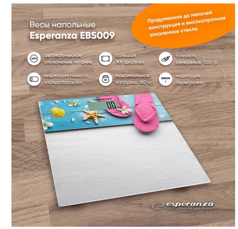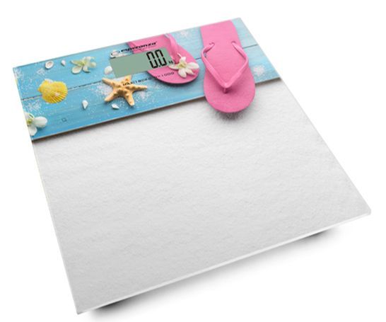 Напольные весы ESPERANZA Flip Flop электронные белой расцветке, с морской тематикой, станут хорошим приобретением для человека, который следит за массой тела и здоровьем. Максимальная нагрузка для платформы из закаленного стекла составляет 180 кг при точности замеров до 100 г. Индикатор перегрузки просигнализирует, если этот порог превышен. Также весы оснащены индикацией низкого заряда батареи. Единица измерения веса: кг / фунт / ст. Устройство включается автоматически, как только пользователь встает на его поверхность. Весы ESPERANZA оснащены увеличенным ЖК-дисплеем 70х34 мм. Питание осуществляется от батареек типа CR2032 (в комплект не входят)