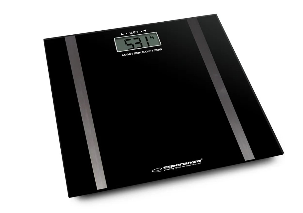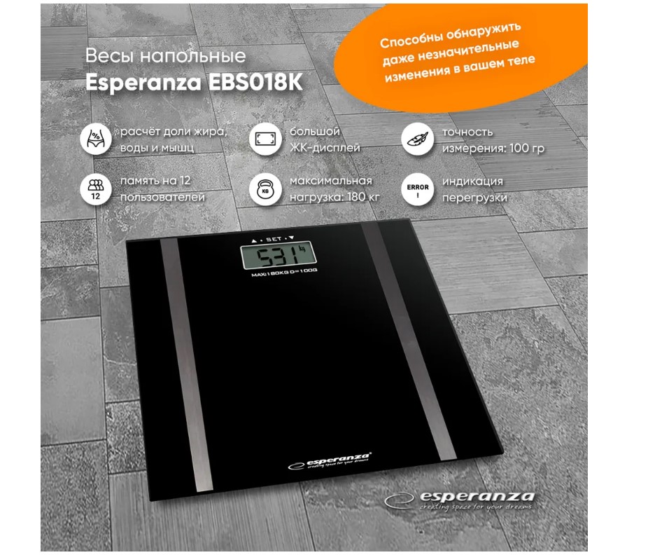 Напольные весы ESPERANZA Samba дают возможность контролировать свою физическую форму. Представленная модель оснащена точными сенсорными датчиками. Устройство позволяет определить не только вес, но и рассчитать, долю воды, жировой, и мышечной ткани. Максимальная нагрузка, на которую рассчитаны эти весы, составляет 180 кг при точности замеров до 100 г. Устройство включается автоматически, как только пользователь встает на его поверхность. Индикатор перегрузки просигнализирует, если этот порог превышен. Также весы оснащены индикацией низкого заряда батареи. Весы сделаны из прочного закаленного стекла толщиной 6 мм. Габариты этой модели соответствуют 300х20х300 мм. Весы ESPERANZA оснащены увеличенным ЖК-дисплеем 70х30 мм. Единица измерения веса: кг / фунт / ст. Питание осуществляется от батареек типа CR2032 (в комплект не входят). Объем встроенной памяти позволяет устройству фиксировать данные для 12 пользователей.