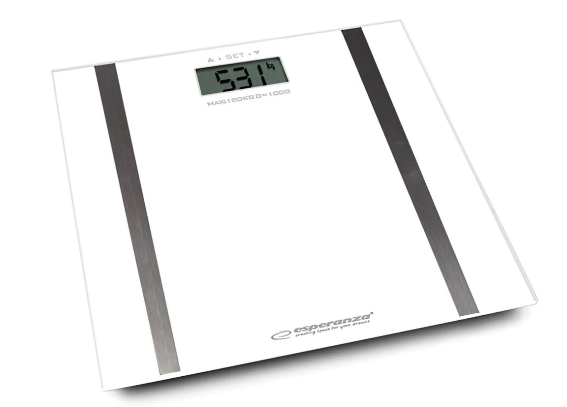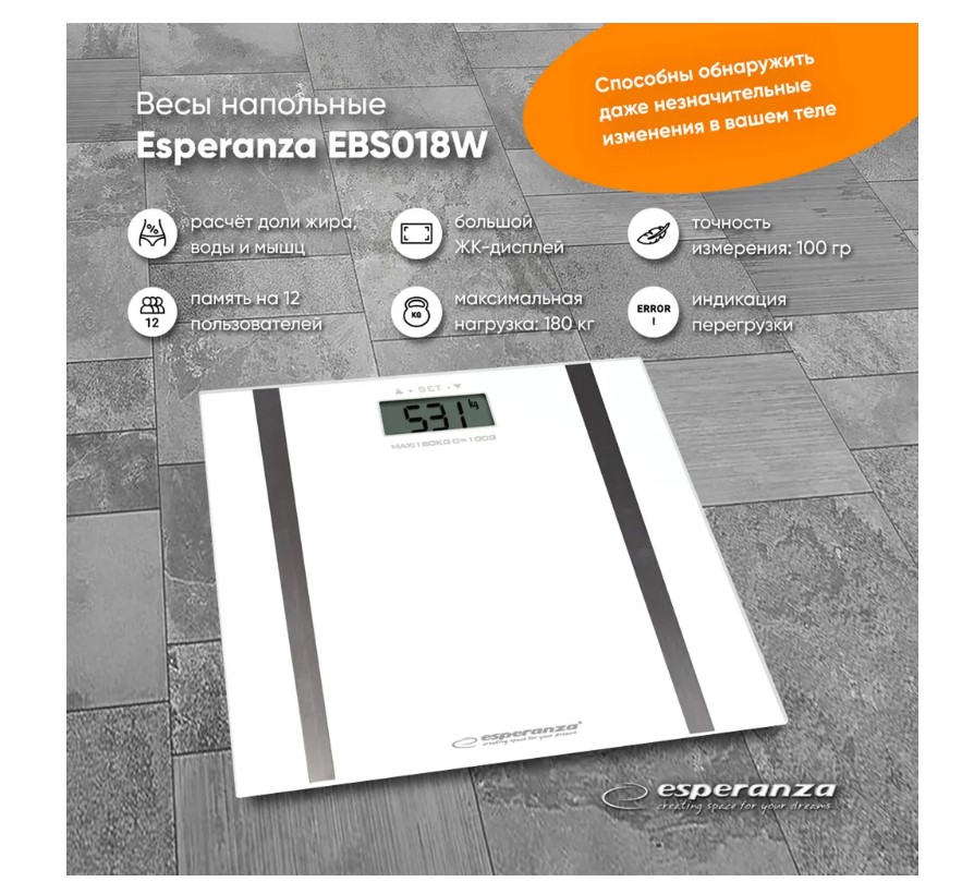 Напольные весы ESPERANZA Samba дают возможность контролировать свою физическую форму. Представленная модель оснащена точными сенсорными датчиками. Устройство позволяет определить не только вес, но и рассчитать, долю воды, жировой, и мышечной ткани. Максимальная нагрузка, на которую рассчитаны эти весы, составляет 180 кг при точности замеров до 100 г. Устройство включается автоматически, как только пользователь встает на его поверхность. Индикатор перегрузки просигнализирует, если этот порог превышен. Также весы оснащены индикацией низкого заряда батареи. Весы сделаны из прочного закаленного стекла толщиной 6 мм. Габариты этой модели соответствуют 300х20х300 мм. Весы ESPERANZA оснащены увеличенным ЖК-дисплеем 70х30 мм. Единица измерения веса: кг / фунт / ст. Питание осуществляется от батареек типа ААА*2шт. (в комплект не входят). Объем встроенной памяти позволяет устройству фиксировать данные для 12 пользователей.