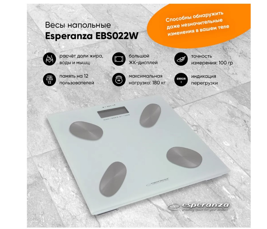 Напольные весы ESPERANZA Cha-cha дают возможность контролировать свою физическую форму. Представленная модель оснащена точными сенсорными датчиками. Устройство позволяет определить не только вес, но и рассчитать, долю воды, жировой, и мышечной ткани. Максимальная нагрузка, на которую рассчитаны эти весы, составляет 180 кг при точности замеров до 100 г. Устройство включается автоматически, как только пользователь встает на его поверхность. Индикатор перегрузки просигнализирует, если этот порог превышен. Также весы оснащены индикацией низкого заряда батареи. Весы сделаны из прочного закаленного стекла толщиной 6 мм. Габариты этой модели соответствуют 300х20х300 мм. Весы ESPERANZA оснащены увеличенным ЖК-дисплеем 70х30 мм. Единица измерения веса: кг / фунт / ст. Питание осуществляется от батареек типа CR2032 (в комплект не входят). Объем встроенной памяти позволяет устройству фиксировать данные для 12 пользователей.