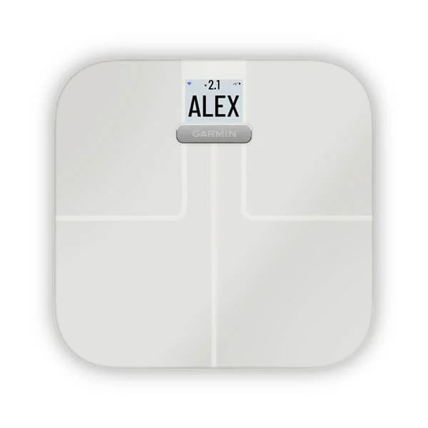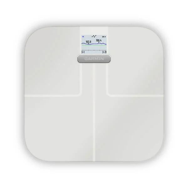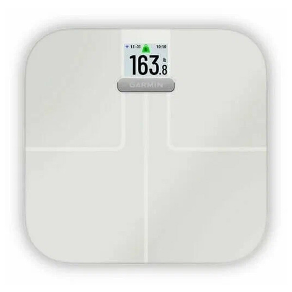 цветной дисплей, виджет погоды, тенденция изменения веса за месяц, синхронизация веса с часами, в комплекте 4 ножки для использования на ковровом покрытии, 4 батареи AAA; приложение Garmin Connect; индикация заряда батареи