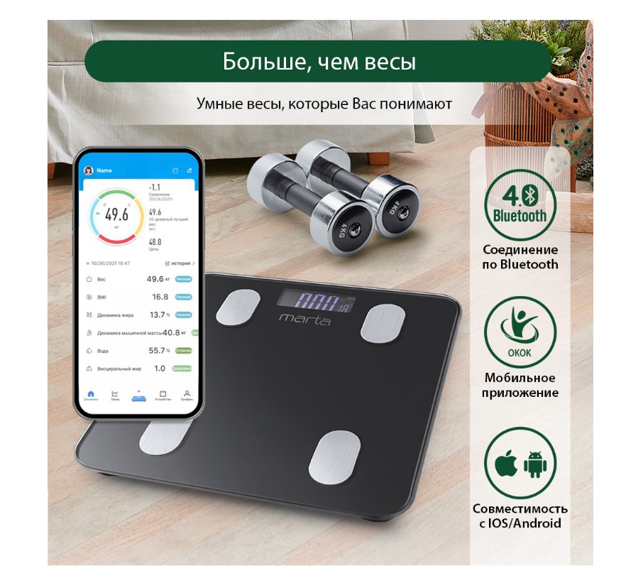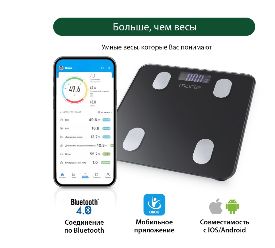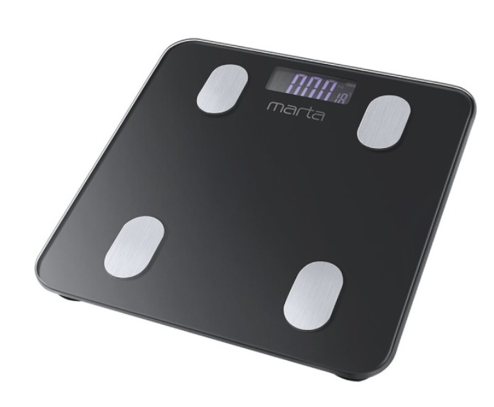 Напольные весы MARTA MT-1683 – умные диагностические весы с 4 сенсорами и синхронизацией с телефоном на Ios и Android.