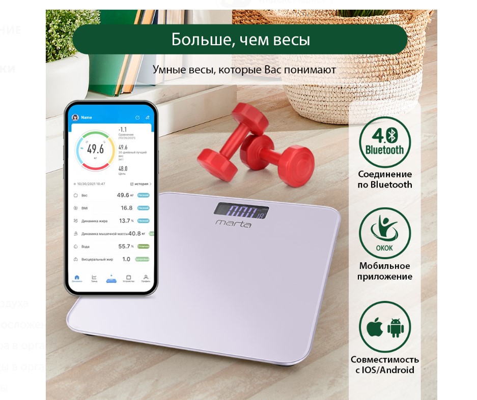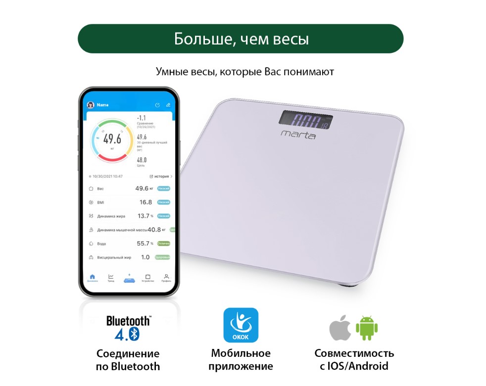 Напольные весы MARTA MT-1684 – умные диагностические весы с ЖК дисплеем и синхронизацией с телефоном на Ios и Android.