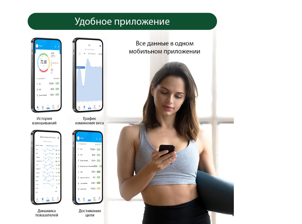 Используются для измерения уровня жира, воды, мышечной и костной массы. Весы обеспечивают взвешивание до 180 килограммов с точностью до 50 граммов, способны работать в различных единицах измерения веса (килограмм / фунт / стоун), в диапазоне значений роста от 75 до 225 сантиметров и в диапазоне значений возраста от 10 до 85 лет.