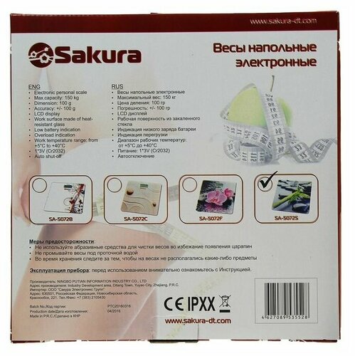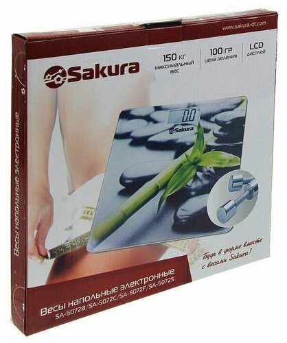 Напольные весы Sakura созданы для женщин, которые неравнодушны к своему здоровью и внешнему виду. Высокочувствительные датчики среагируют на перегруз. Включение одним прикосновением и автоматическое выключение делают данную модель особенно удобной в использовании. Платформа закалённого стекла устойчива к давлению и ударам, а ультратонкий корпус обеспечивает комфортное хранение. Прибор отлично впишется в интерьер и будет радовать глаз оригинальным ярким дизайном.